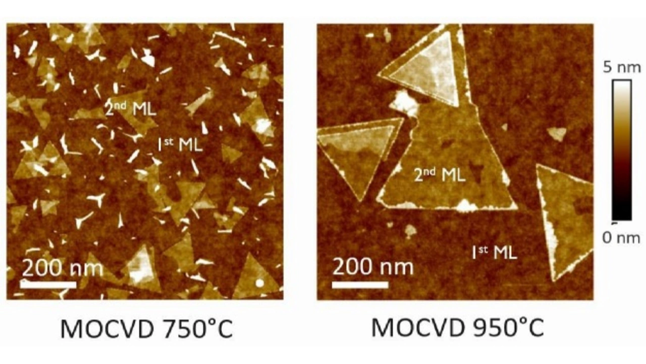 Neben verschiedenen anderen Parametern hat die Wachstumstemperatur einen Einfluss auf die Materialqualität. Das imec-Team untersuchte den Einfluss der Wachstumstemperatur, indem es WS2-Schichten charakterisierte, die entweder bei 750°C oder 950°C abgeschieden wurden. Mit höherer Abscheidungstemperatur wurde eine Zunahme der WS2-Kristallkorngröße beobachtet. Eine verbesserte Kristallinität und reduzierte Defektivität der WS2-Schicht wurde mit erhöhter Abscheidetemperatur bestätigt.