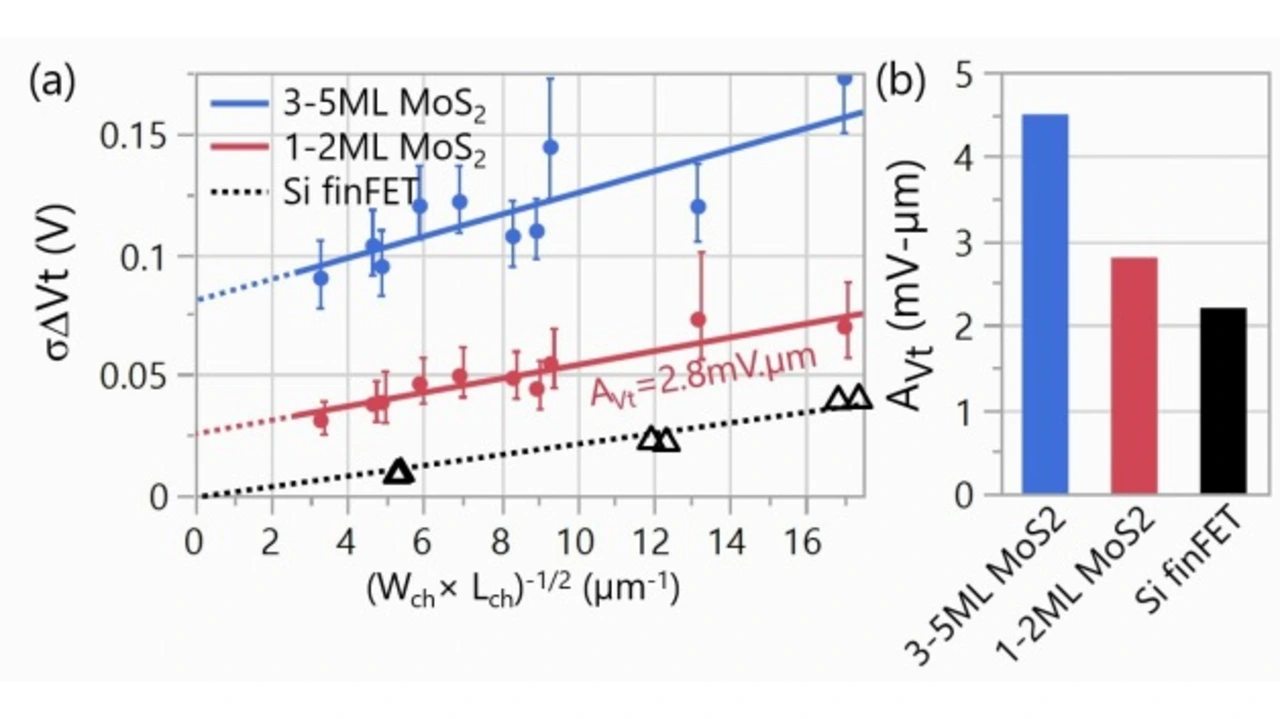 Sie simulierten und bauten Bauelemente mit einem medianen SS-Wert (SS: Subthreshold-Steilheit) von 80mV/dec und Imax >100µA/µm und fanden heraus, dass eine Verdünnung des 2D-Materials von drei Monolagen (ML) auf eine zu einem stark reduzierten SS und einer geringeren Schwellenspannungsvariabilität führt. Die Forscher bewerten diese Ergebnisse als ermutigend, da sehr dünne Kanäle für die weitere Skalierung von Transistoren benötigt werden. Insgesamt zeigte sie, dass bei atomdicken Kanälen die intrinsische Variabilität gering und mit Si-FinFETs vergleichbar ist. Eine bessere Kontrolle wichtiger Prozessschritte wie Reinigung und Kontakte dürfte die Variabilität der Bauelemente weiter senken und sie für zukünftige Knotenpunkte geeignet machen.