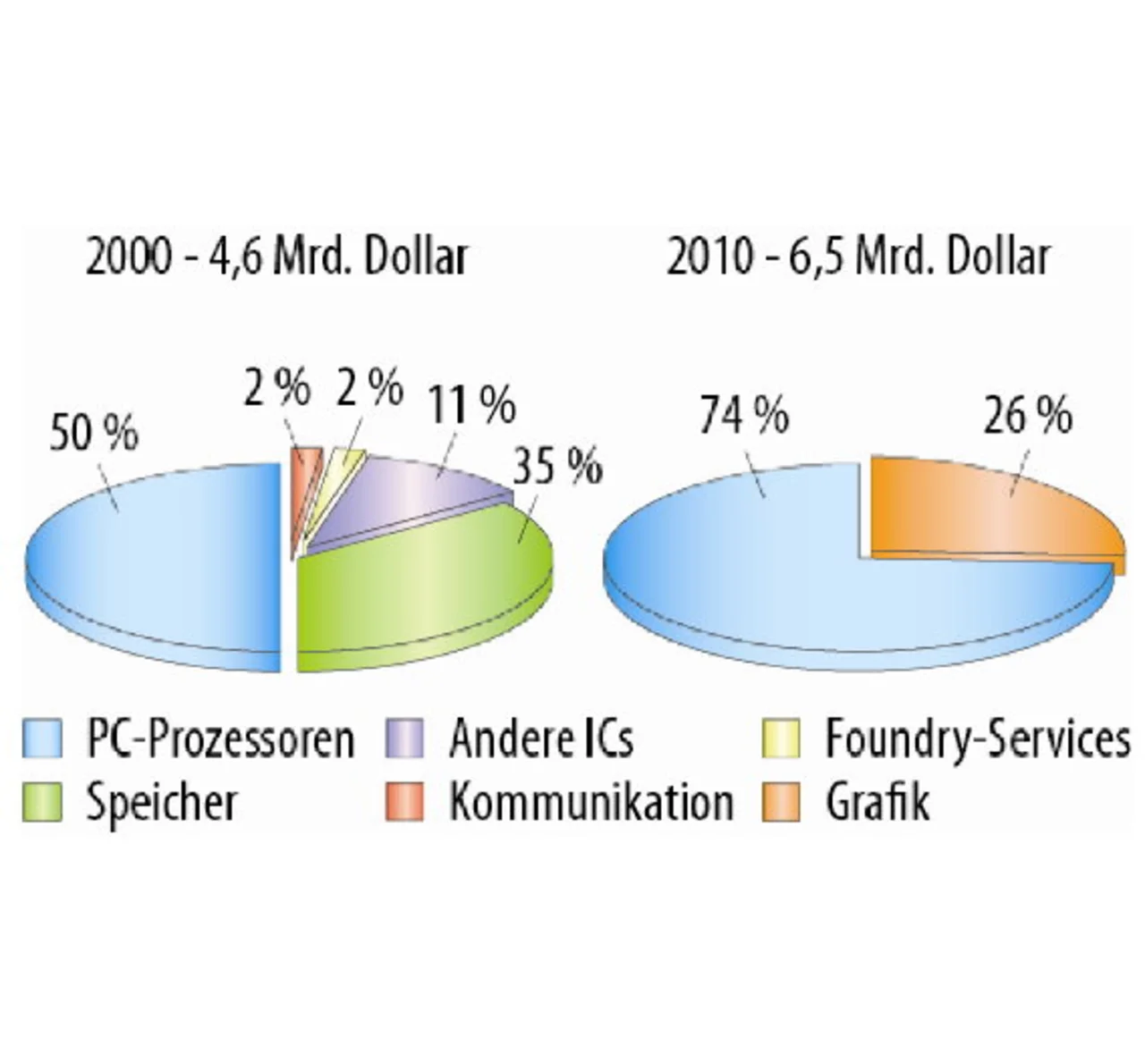 Das AMD von heute hat mit dem AMD des Jahres 2000 nicht mehr viel zu tun. Wie in Bild 1 ersichtlich ist, gab es 2000 mehr Produktlinien, viel Umsatz mit Speichern und 1999 den Spin-Off des Geschäftes mit programmierbarerer Logik (PLDs und FPGAs) in die Firma Vantis, die später von Lattice Semiconductor gekauft wurde. Zehn Jahre später hatte man auch das Speichergeschäft in die Firma Spansion und das Kommunikations-Chip-Geschäft in die Firma Legarity ausgelagert. Das damalige AMD-Management wollte sich ganz auf den seinerzeit schnell wachsenden PC-Markt wegen der hohen Margen konzentrieren und über die Jahre hat man sich dann von allen Geschäftsbereichen getrennt, die nicht direkt mit PCs oder Servern zusammenhängen.