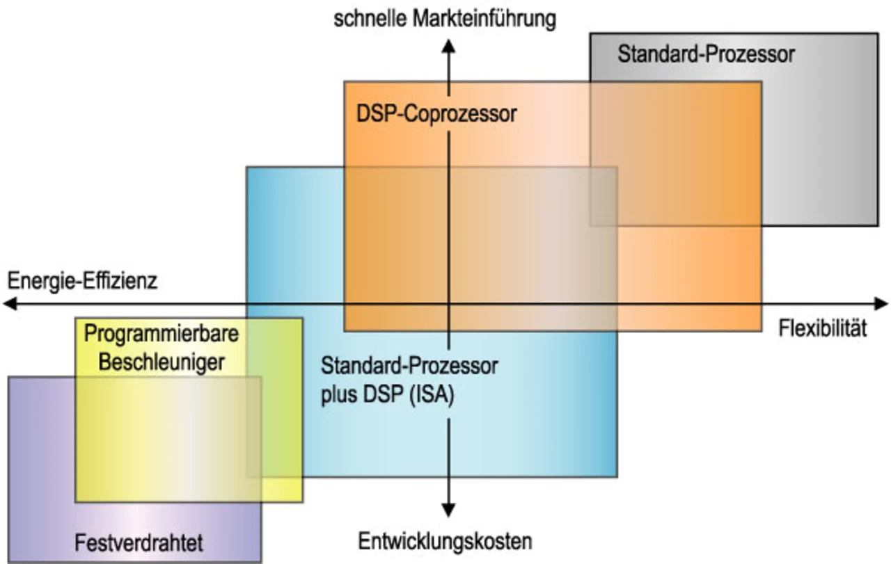 Ein Standard-Prozessor plus DSP Instruction Set Architecture (ISA) liefert moderate Verbesserungen, leidet aber unter Leistungsmangel und fehlender Flexibilität – Beispiel: Intel PXA255/26x.