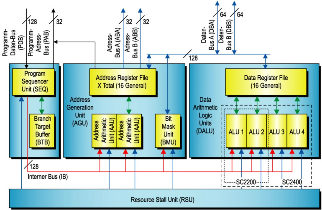Bild 2 zeigt die Architektur des Kerns der SC2000-Familie und Bild 3 die Peripherie, die von StarCore als Subsystem angeboten wird. Genau wie sein Vorgänger enthält der SC2000-Kern zwei oder vier unabhängige Data-Aritmetic-Logic-Units, zwei unabhängige Address-Arithmetic-Units (AAU), eine Bit-Mask-Unit (BMU), zwei 64-bit-Datenbusse, zwei 32-bit-Adressbusse, einen 32-bit-Programm-Adressbus, einen 128-bit-Programm-Datenbus, sechzehn orthogonale 40-bit-Datenregister und 27 Adressregister, wovon 16 orthogonale, universelle Adressregister sind. Dazu wurden eine neue Resource Stall Unit (RSU) und ein Branch Target Buffer (BTB) hinzugefügt, um das partielle Pipeline Interlocking und die dynamische Branch Prediction zu vereinfachen. Bei den Subsystemen wurde eine neue Memory Protection Unit (MPU20) eingeführt, um den Speicherschutz zu gewährleisten und Echtzeit-Betriebssystem-Modi zu unterstützen.