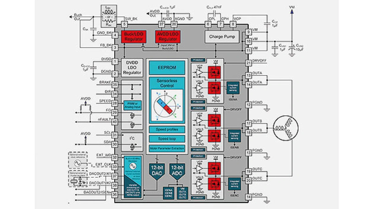 Texas Instruments bringt für bürstenlose Gleichstrommotoren (BLDC) 70-W-Treiber auf den Markt, die ganz ohne Programmcode oder Sensoren auskommen und eine Trapez- bzw. Vektorregelung (FOC) ermöglichen.