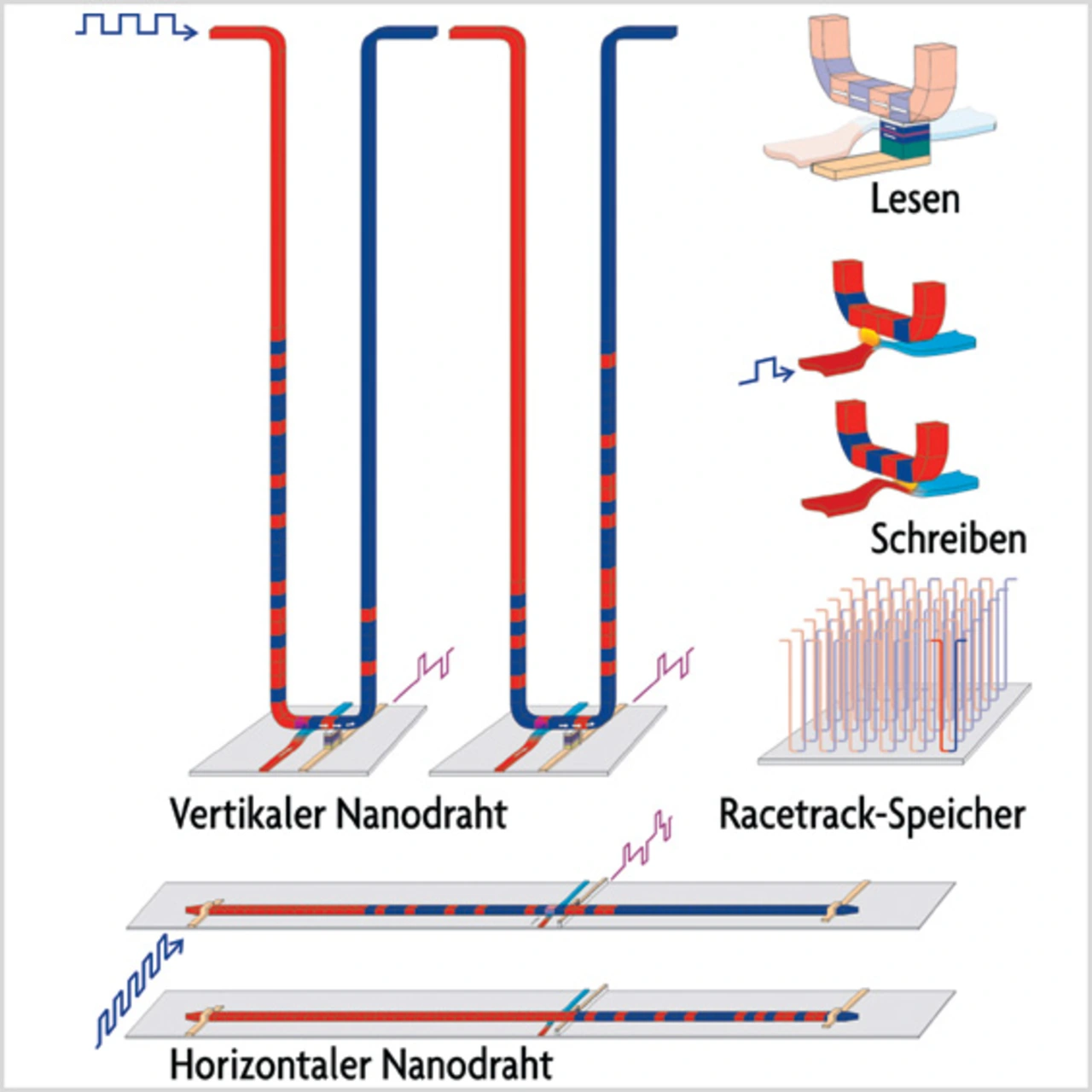 Das Konzept beruht auf der Speicherung von Informationen in Form von winzigen, gegensätzlich magnetisierten Regionen (Domänen) in einem Nanodraht. Bei der herkömmlichen als Speichermedium verwendeten Festplatte werden das Medium und ein Schreib-/Lesekopf bewegt, um Daten zu lesen, zu schreiben oder zu löschen. Anders beim Nanodraht: Hier werden die magnetischen Domänen zu den zentralen Lese- und Schreibeinheiten, die in der Mitte des Nanodrahtes angebracht sind, hin verschoben – und dies mit extrem hoher Geschwindigkeit. Die gespeicherten Datenbits scheinen durch den Datenleiter zu „rasen“, daher der Name „Racetrack“.