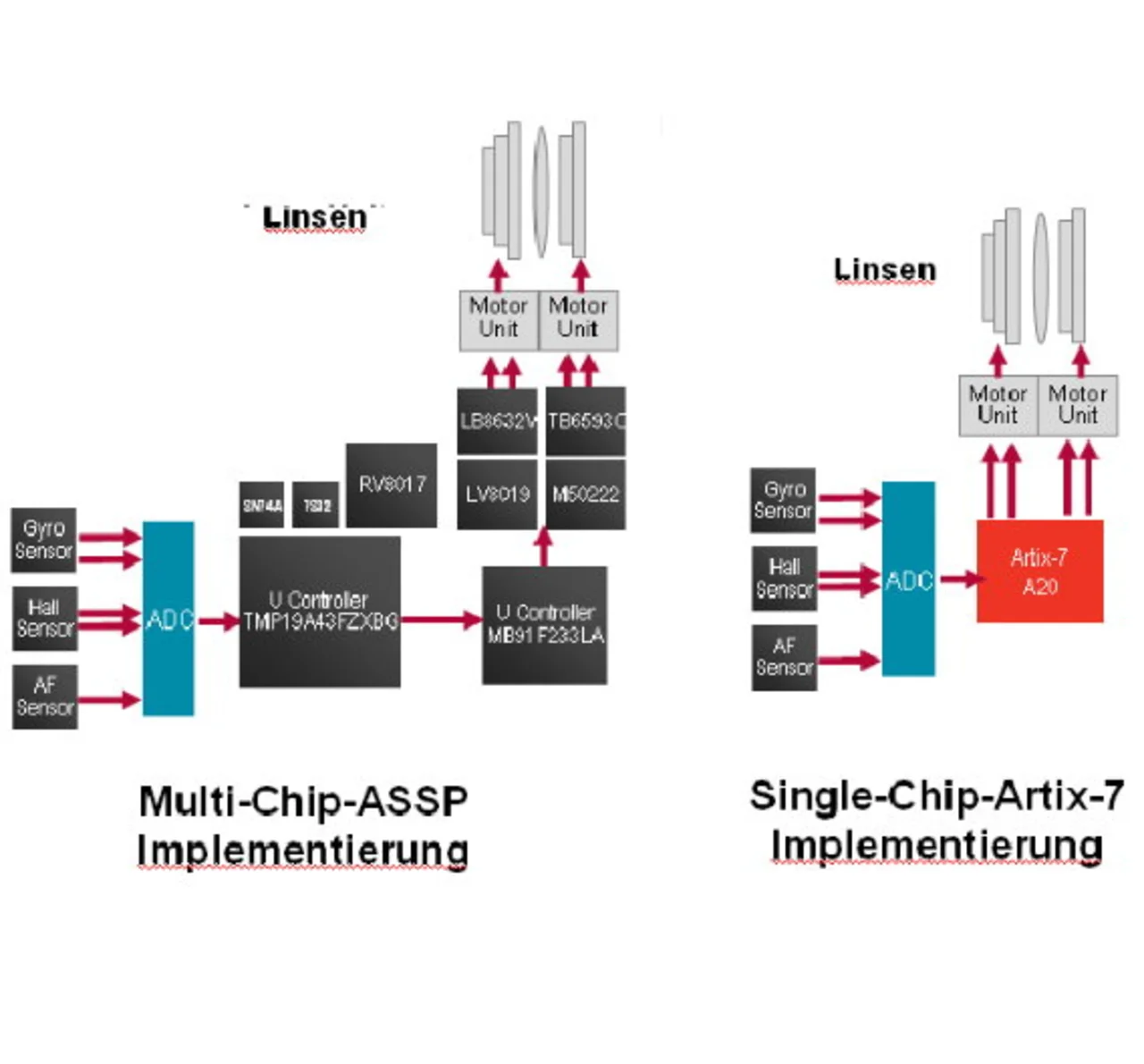 Eine heutige Lösung eines großen japanischen Kameraherstellers zeigt das Bild: Da sich die Entwicklung eiens ASICs wirtschaftlich nicht lohnte, musste auf 9 ASSPs zurückgegriffen werden, um das Wechselobjektiv anzusteuern. Diese Lösung kostete rund 15 US-Dollar, nimmt 900 mW Leistung auf und hat hat eine Gesamtfläche von 655 mm2. Mit einem Artix-7-FPGA des Typs A20-CPG236, das weniger als 5 US-Dollar kosten wird, werden nur noch 575 mW aufgenommen und 100 mm2 Fläche belegt. Weitere Zielgruppen sind z.B. tragbare Ultraschallgeräte, die maximal 2 W aufnehmen dürfen, und Automobil-Infotainment-Systeme.