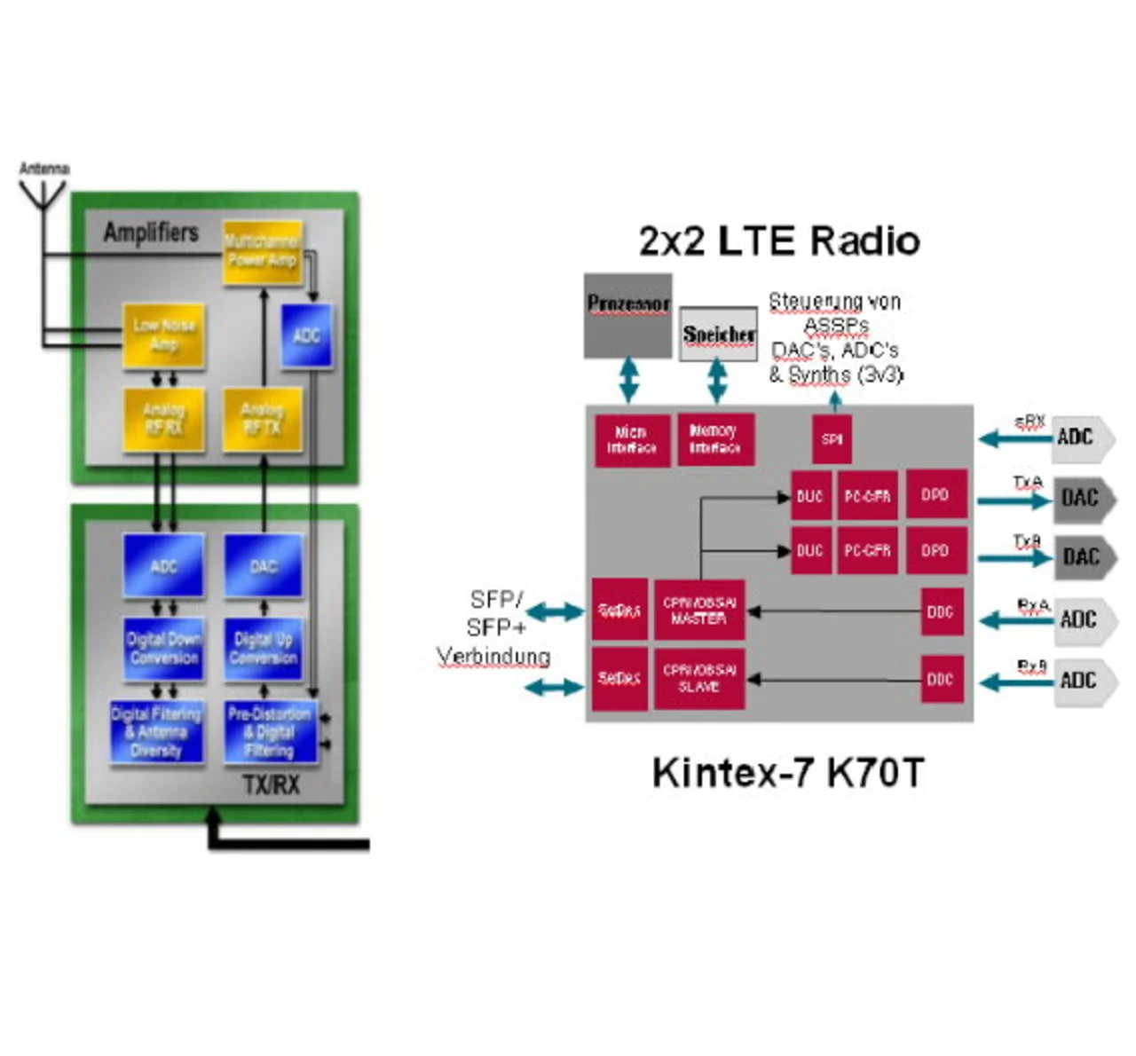Die zweite Familie heisst Kintex-7 und positioniert sich in der Leistungsklasse des Virtex-6. Dabei ist es jedoch 50 % billiger und nimmt 50 % weniger Leistung auf. Eine typische Anwendung ist ein Wireless-Multi-Mode-Radio (Bild), wo die Kunden auf eine Redktion der Investitions- und vor allen Dingen Betriebskosten achten.