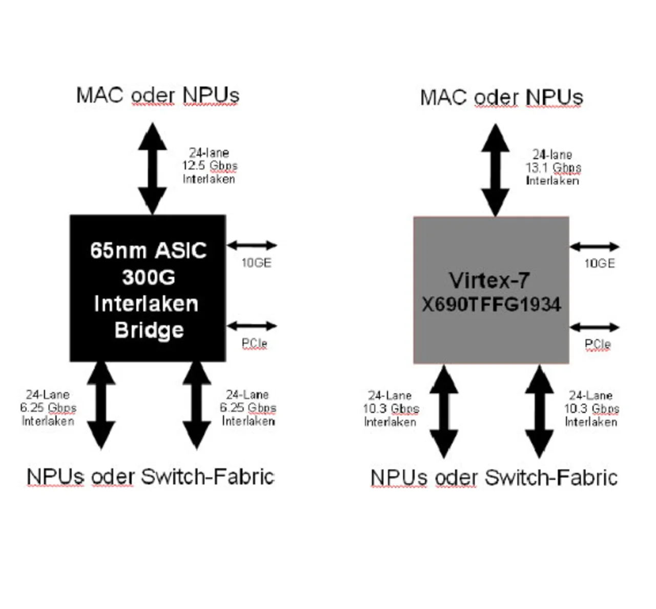 Erstmals werden dank dieser Verbesserungen elektrische Eigenschaften erreicht, die bisher ASICs vorbehalten waren. Ein Beispiel ist eine 300-G-Interlaken-Brücke (Bild), die typischerweise in einem 65-nm-Prozess ausgeführt wird. Das ASIC beinhaltet rund 10 Mio. Gatter (was beim FPGA rund 690000 LEs entspricht), hat eine I/O-Bandbreite von 1,2 Tbit/s und nimmt 30 W auf. Ein Virtex-7-FPGA erreicht 1,6 Tbit/s und nimmt dabei 30,4 W auf - Werte die mit dem Virtex-6 unerreichbar waren.