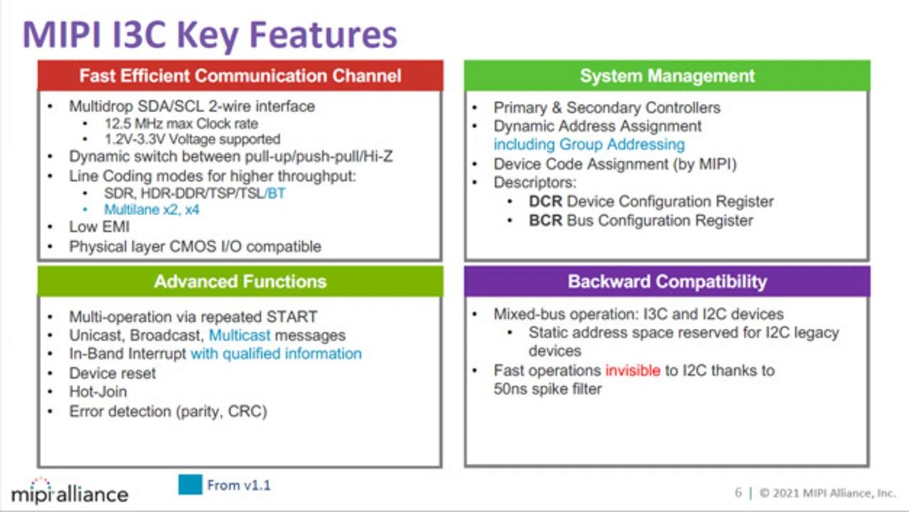 In Verbindung mit der Veröffentlichung von I3C Basic v1.1.1 hat MIPI Alliance die Neuerungen auch auf die I3C-Kernspezifikation übertragen, die jetzt v1.1.1 heißt und nur Mitgliedern zur Verfügung steht. Sowohl I3C als auch I3C Basic v1.1.1 wurden außerdem überarbeitet, um strittige Begriffe durch präzisere Ausdrücke zu ersetzen.
