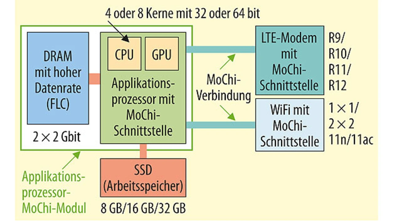Mit MoChi können wir im Gegensatz zu komplizierten SoCs die Funktionen in wiederverwendbare Blöcke aufspalten, z.B. der CPU-Komplex wird zu einem Funktionsblock und mehrere Speicher-Peripherieschaltungen werden zu einem anderen. Weitere Funktionsblöcke umfassen Funkstandards wie WiFi oder Ethernet. Alle diese Funktionsblöcke lassen sich dann per MoChi im Daisy-Chain-Verfahren miteinander verbinden.