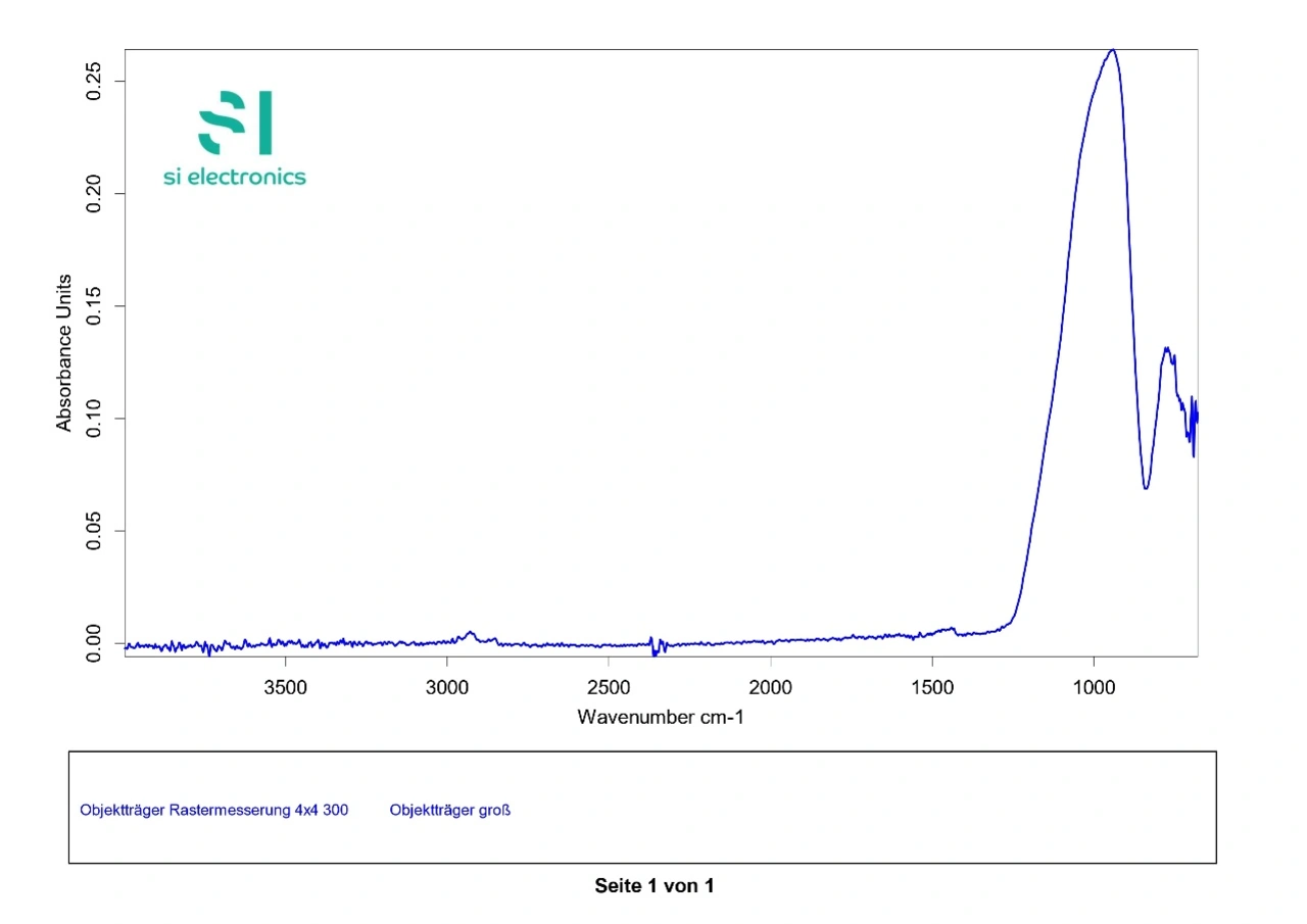 Um ausschließlich den FTIR-Fingerabdruck des Füllstoffs zu veranschaulichen, wurde anstelle des Füllstoffs selbst ein Silikatglas gemessen. Wie in Bild 3 gut ersichtlich ist, weist das Glas keine ausgeprägte Infrarotaktivität auf. Das Spektrum wird vor allem von einer sehr breiten Bande im Wellenbereich von etwa 1000 cm-1 dominiert.