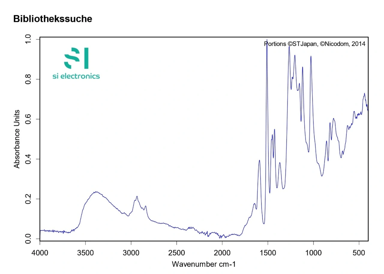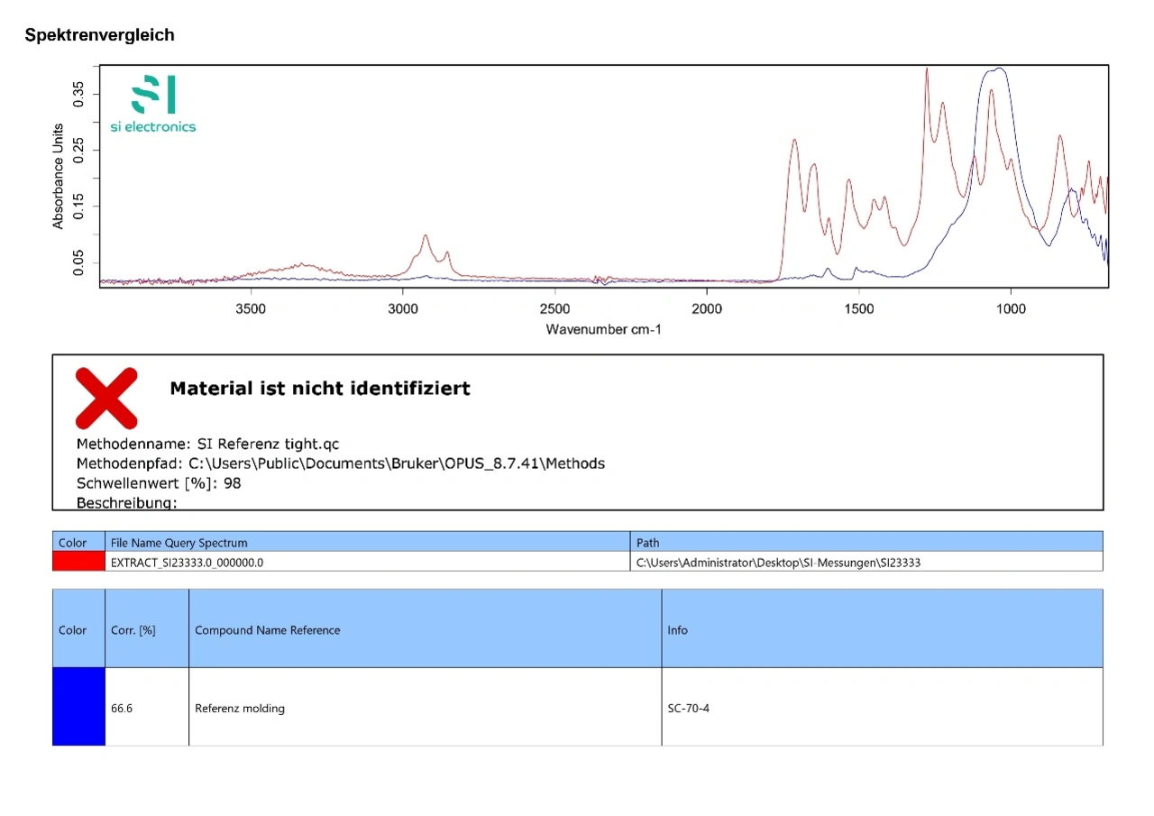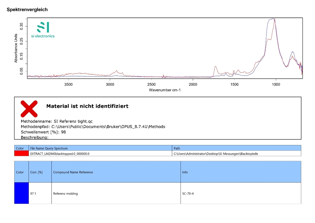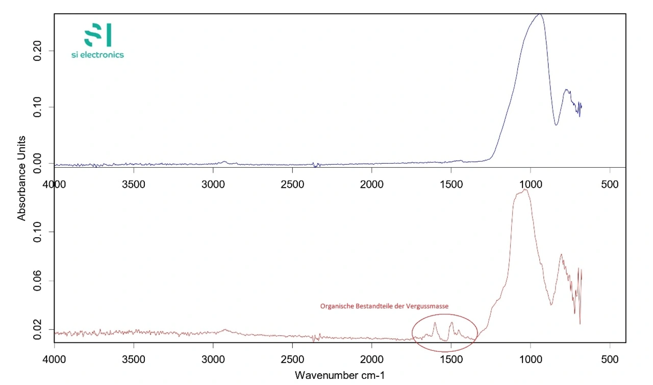Das Absorptionsspektrum des in Abbildung 1 gezeigten Bauteils (blau) im Vergleich zum Referenzspektrum (rot) zeigen sich deutliche Unterschiede. Die breite Bande, die durch die Si-O-Verbindung, also den Füllstoff, in der Standardvergussmasse verursacht wird, kann im untersuchten Prüfling nicht erkannt werden. Das Spektrum des verfälschten Bauteils wird hauptsächlich durch eine organische Auflagerung beeinflusst. Der Vergleich mit der SI-Datenbank ergab, dass es sich hierbei um einen Lack handelt. Bei diesem Bauteil handelt es sich jedoch um eine sehr einfach zu erkennende Fälschung, die auch mit den Standardmethoden gut nachgewiesen werden kann.