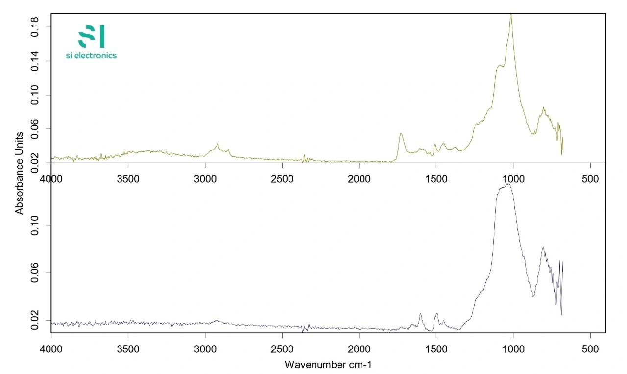 In diesem Fall bleibt die breite Bande des Füllstoffs gut erkennbar. Allerdings fällt auf, dass ein deutlich ausgeprägter Peak bei einer Wellenzahl von 1000 cm-1 zu verzeichnen ist, begleitet von mehreren schwächeren Peaks im Bereich von 1400 bis 1800 cm-1. Diese Peaks sind auf das Epoxidharz zurückzuführen, das verwendet wurde, um den Abrieb der Originalgehäuse als neue Beschichtung auf den Bauteilen anzubringen. Der Vergleich der Spektren zeigt trotz festgestellter Unterschiede eine Übereinstimmung von 96,5 Prozent. Allerdings bleibt zu beachten, dass dieser Wert unterhalb der in der Praxis beobachteten Streuweite in authentischen Gehäusen liegt. Dies unterstreicht die Notwendigkeit eines fundierten Wissens über die Zusammensetzung der zu untersuchenden Proben sowie der angewandten Methodik und Interpretation bei der Auswertung der FTIR-Ergebnisse.