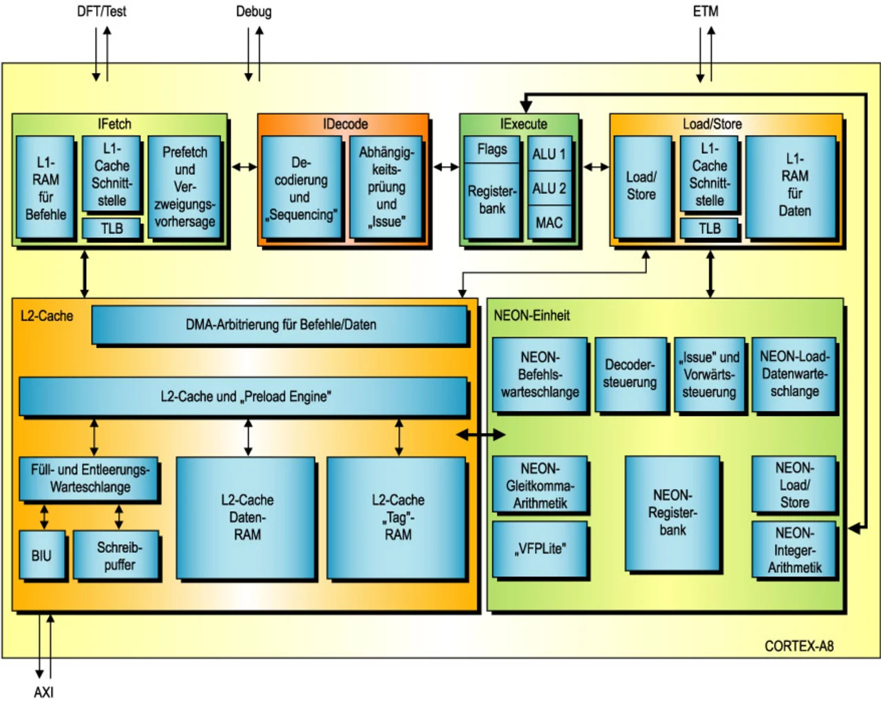 Der von der britischen Prozessorschmiede ARM, Ltd., neu vorgestellte Prozessor „Cortex A8“ ist der zweite in einer neuen Generation von Prozessor-Cores, die ARM im Rahmen seiner Cortex-Familie auf den Markt gebracht hat. Gleichzeitig ist es der erste Applikationsprozessor in dieser Familie intelligenter Prozessoren. Mit einem hohen Maß an Leistungsfähigkeit und Energieeffizienz zielt der Prozessor auf ein breit gefächertes Spektrum leitungsgebundener und drahtloser Produkte. Die Spanne reicht von mobilen Handheld-Geräten über Set-Top-Boxen, Media-Gateways und Spielkonsolen bis hin zu Navigations- und Unterhaltungssystemen fürs Auto. Der Prozessor-Core deckt als Applikationsprozessor eine ganze Palette von Leistungsklassen ab. Er kommt in anspruchsvollen Consumer-Applikationen auf bis zu 2000 Dhrystone-MIPS, während er sich andererseits mit weniger als 300 mW Leistung begnügt, wenn in mobilen Geräten Sparsamkeit gefragt ist. Bild 1 zeigt den Aufbau des Cortex A8.
