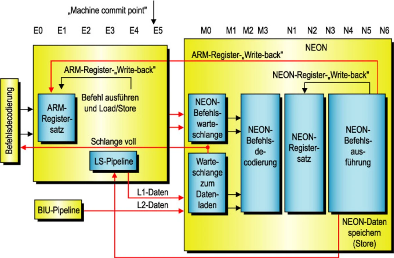 Die NEON-Engine wird durch die „NEON Instruction Queue“ (NIQ) von der Integer-Pipeline entkoppelt. Die „Instruction Execute Unit“ kann in jedem Taktzyklus bis zu zwei gültige Instruktionen an die NEON-Engine übergeben. Von der NEON-Einheit führen 128 bit breite Load- und Store-Pfade zum Level-1- und zum Level-2-Cache, und auch das Daten-Streaming aus beiden Caches wird unterstützt.