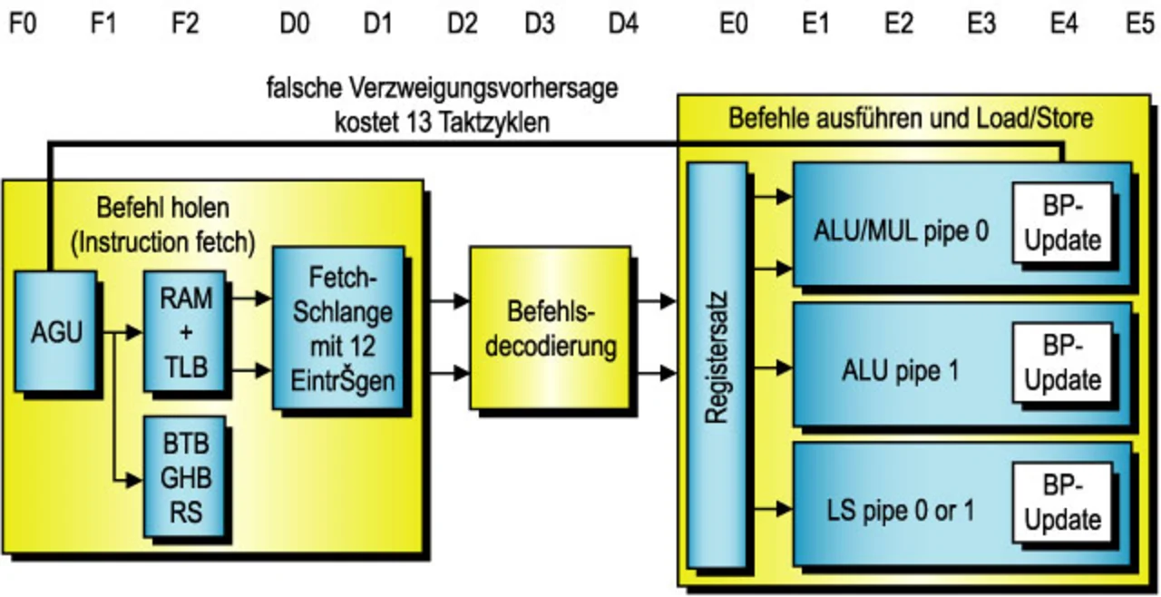 Mit der Entscheidung zugunsten einer 13-stufigen Pipeline wollte man die Voraussetzungen für wesentlich höhere Taktfrequenzen schaffen, als sie mit den bisherigen Generationen von ARM-Mikroarchitekturen möglich waren. Die mit F0 bezeichnete Stufe wird übrigens nicht mitgezählt, da sie lediglich der Adressgenerierung dient. Um den Mehraufwand zu minimieren, der durch eine derart tiefe Pipeline bei Verzweigungen entsteht, bedient sich der Cortex-A8-Prozessor einer Funktion zur Vorhersage von Verzweigungen. Diese Stufe beruht auf einer zweistufigen, globalen Verarbeitungs-Historie und enthält zwei verschiedene Strukturen, nämlich den „Branch Target Buffer“ (BTB) und den „Global History Buffer“ (GHB). Auf beide wird bei „Instruction Fetches“ (Befehl holen) parallel zugegriffen.