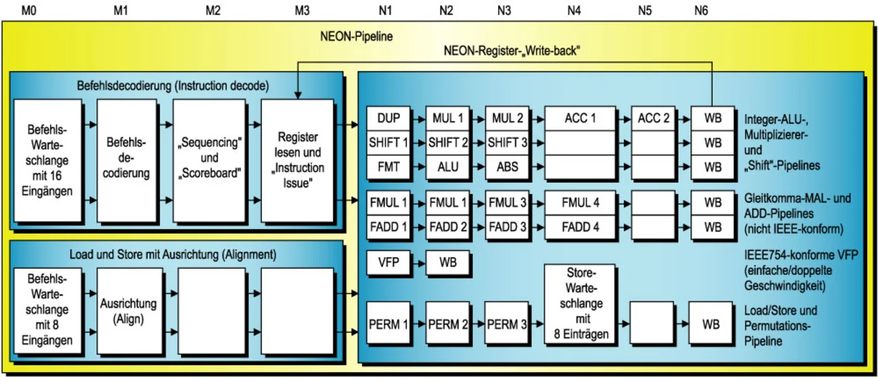 Die NEON Media Engine besitzt eine eigene 10-stufige Pipeline, die am Ende der Integer-Pipeline beginnt. Da wie erwähnt alle fehlgeschlagenen Verzweigungs-Vorhersagen und Exceptions in der Integer-Einheit aufgelöst wurden, muss eine an die NEON Media Engine übergebene Instruktion stets ausgeführt werden, denn Exceptions können von ihr nicht mehr erzeugt werden. Die NEON Engine enthält drei SIMD-Integer-Pipelines, ei-ne Load-Store/Permute-Pipeline, zwei SIMD-Single-Precision Floating-Point-Pipelines und eine Vektor-Gleitkomma-Einheit (Vector Floating-Point Unit – VFPLite) ohne Pipeline.