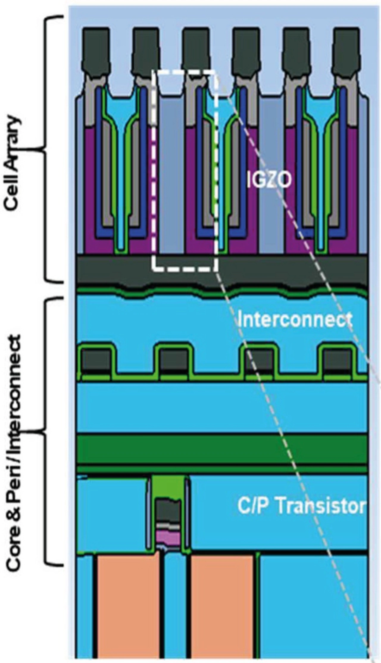 Die Forscher von Samsung waren der Überzeugung, dass diese Probleme nur mit einer vollkommen neuen DRAM-Zellenstruktur in Kombination mit alternativen Kanalmaterialien wie IGZO (Indium-Gallium-Zink-Oxid) in den Griff zu bekommen sind. Auf der IEDM 2023 haben sie das Ergebnis ihrer Überlegungen gezeigt: Ein DRAM mit VTCs (Vertical-Channel-Transistoren), bei denen IGZO als Kanalmaterial verwendet wurde. IGZO zeichnet sich durch eine hohe Elektronenbeweglichkeit, geringe Leckströme und ein hohes Ein-/Aus-Verhältnis aus, was zu einem niedrigen Stromverbrauch führt und sich für die Verarbeitung bei niedrigen Temperaturen eignet.