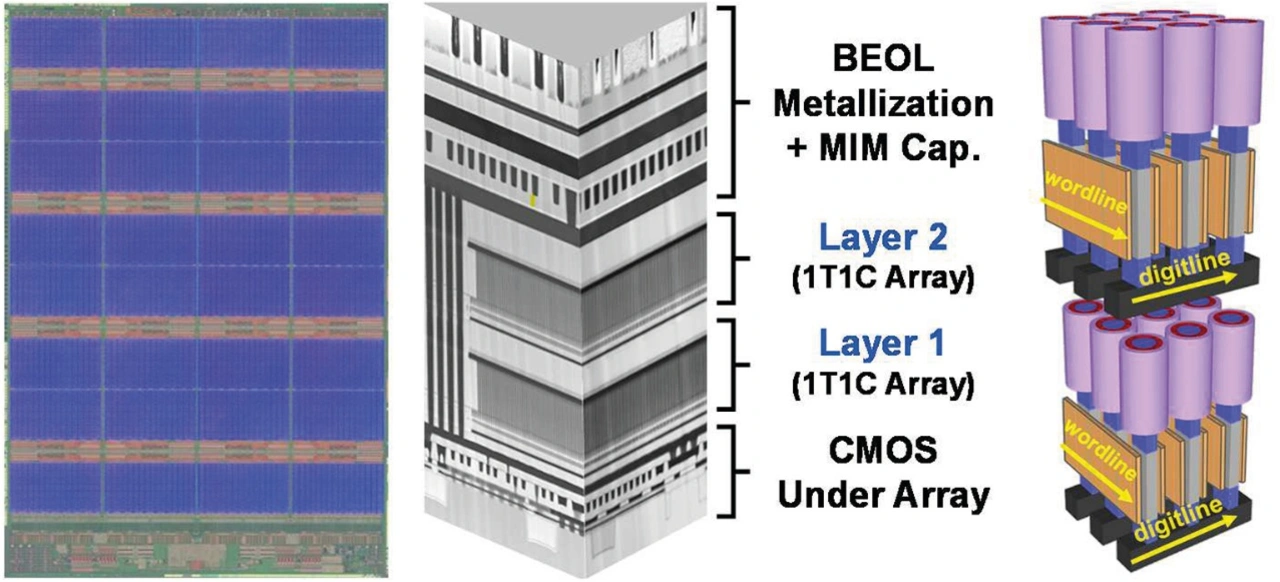 Und genau darauf zielt ein Vortrag von Micron Technology ab. Forscher von Micron stellen eine neue Speichertechnologie für diese Anwendungen vor, die sie NVDRAM nennen. Dabei handelt sich um die weltweit erste zweilagige ferroelektrische Speichertechnologie, die stapelbar, leistungsstark, hochdicht (32 Gbit) und nichtflüchtig ist. Sie kombiniert die nichtflüchtige, auf langen Datenerhalt ausgelegten ferroelektrischen Speicherzellen mit DRAM-ähnlichen Lese-/Schreibgeschwindigkeiten und übertrifft außerdem die Zeit des Datenerhalts, die NAND-Speicher erreichen. Das NVRAM basiert auf einem sehr kleinen ferroelektrischen Kondensator (5,7 nm) als Speicherzelle und einem stapelbaren, polykristallinen Siliziumtransistor mit Dual Gate als Zugriffskomponente. Um eine hohe Speicherdichte zu erreichen, werden zwei Speicherschichten mit einer 4F2-Architektur und einem Pitch von 48 nm über einer CMOS-Schaltung angeordnet.