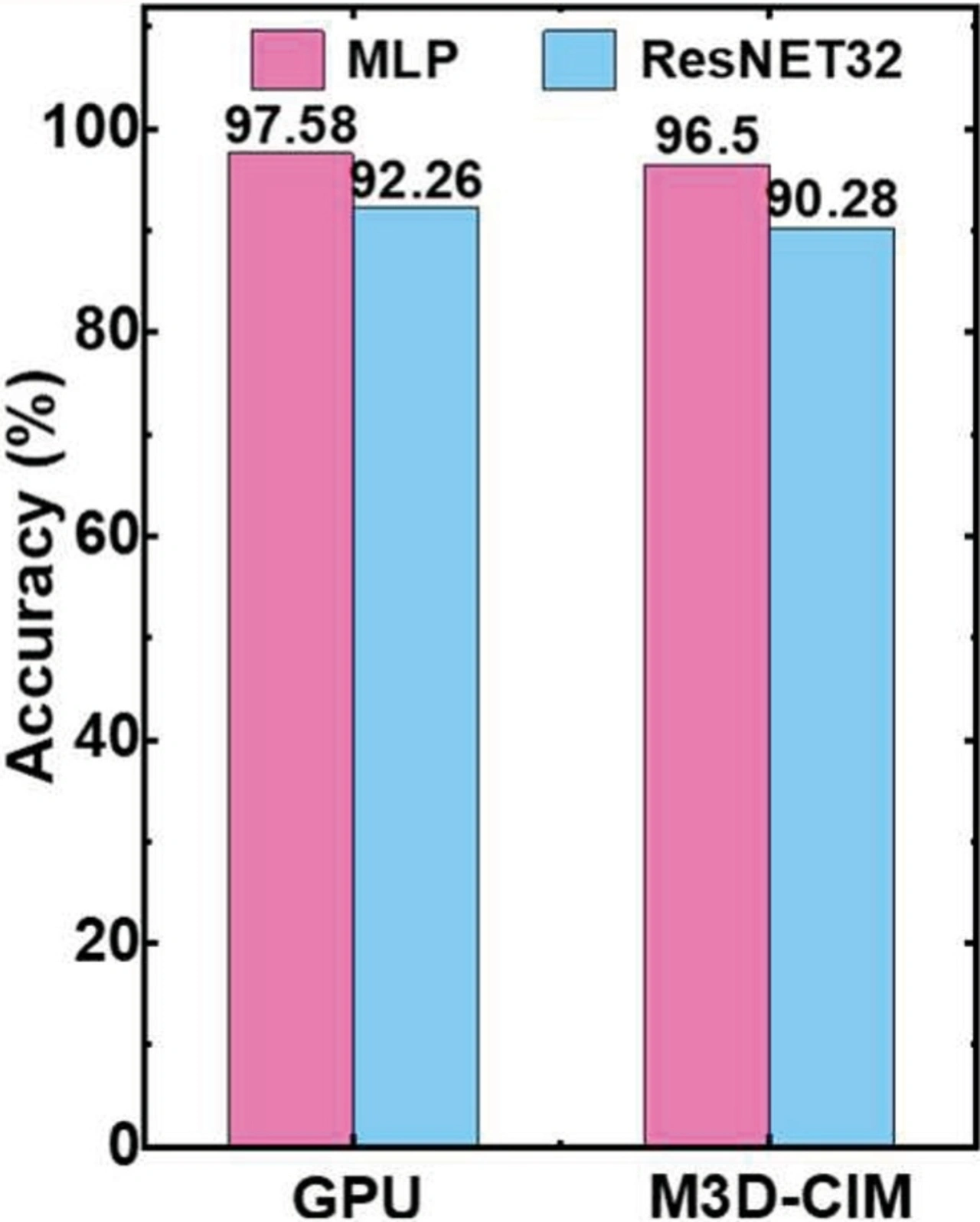 Das Team unter der Leitung der Tsinghua-Universität hat eine monolithische 3D-Bauelementarchitektur (M3d-CIM) entwickelt, bei der Puffer-Arrays direkt auf den CIM-Arrays angeordnet sind und über dichte, feinkörnige Vias verbunden sind, was die Bandbreite erhöht. Das 1-kbit-Array besteht aus drei Funktionsschichten: eine Si-CMOS-Logikschicht, ein RRAM-Array als CIM-Schicht und eine CNT-RRAM-Schicht für den Daten-Cache. Alle Komponenten und Schaltungen wurden charakterisiert, um zu bestätigen, dass jede Schicht wie vorgesehen funktioniert. Mit diesem Ansatz konnten die Forscher bei der Bildklassifizierung mit MLP- und ResNET32-Netzwerken eine GPU-äquivalente Genauigkeit von zirka 96,5 Prozent erreichen, wobei der Energieverbrauch um den Faktor 39 und die Inferenzzeit um den Faktor 49,6 geringer ausfallen.