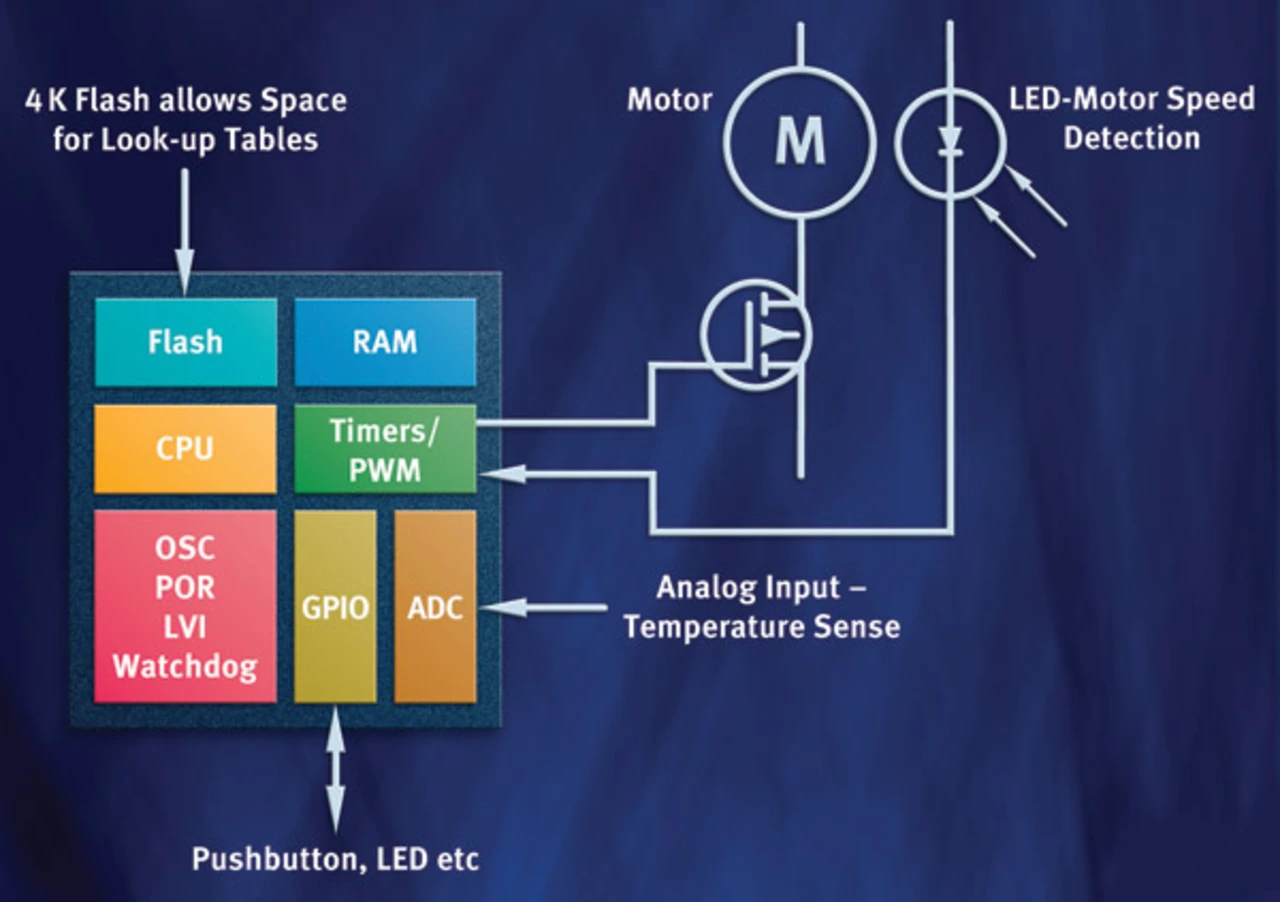 In Bild 1 ist das Blockschaltbild eines derartigen Systems auf Basis eines 8-Bit- Mikrocontrollers dargestellt. Neben dem A/D-Wandler des MCUs kommen seine Timer und PWM-Funktionen zum Regulieren der Motordrehzahl zum Einsatz. Im Flash-Speicher können Wertetabellen zum Linearisieren des Sensorsignals sowie der Programmcode abgelegt sein. Überdies lassen sich die Timer verwenden, um den Lüfter zu bestimmten Zeiten ein- und auszuschalten. Auch die UART-, I2C- oder CSI-Schnittstellen (Clocked Serial Interface) lassen sich zur Kommunikation mit externen Systemen nutzen. Bereits solch ein relativ einfaches System kann von der Leistungsfähigkeit eines Mikrocontrollers profitieren. Drehzahl und Temperaturgrenzwerte sowie Ein/Aus- Intervalle lassen sich in den MCU einprogrammieren, sodass sich ein und dasselbe System für unterschiedliche PCs verwenden lässt. Damit ein solches Plattformkonzept allerdings praktikabel wird, müssen die Kosten auf ein absolutes Minimum gedrückt werden. Abgesehen von der Minimierung des Bauteileaufwands sind hierzu auch die Leiterplattenfläche und die Produktionskosten auf ein Mindestmaß zu reduzieren.