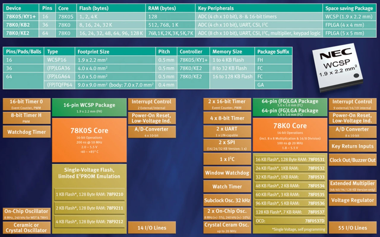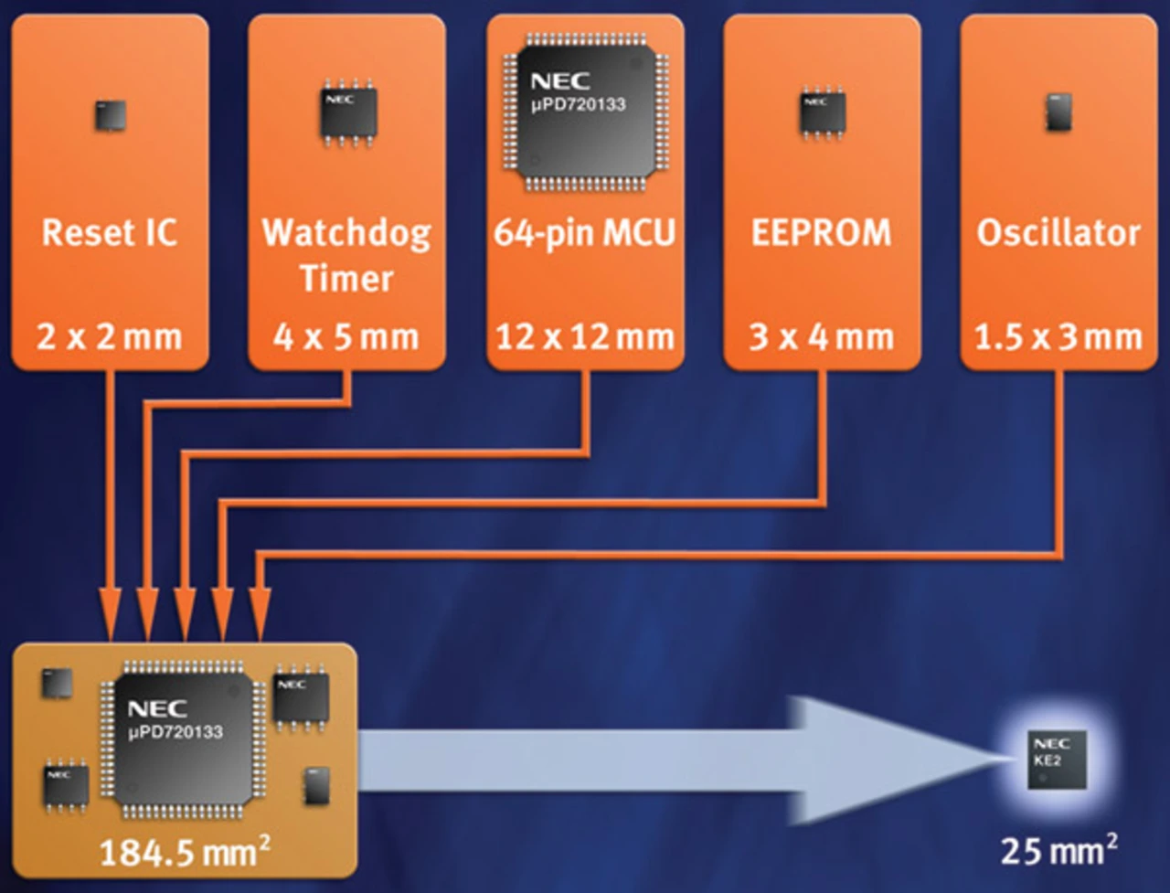 Um den hohen Anforderungen, die an heutige Mikrocontroller gestellt werden, gerecht zu werden, bietet NEC Electronics eine umfangreiche Palette an 8-, 16- und 32-Bit-Mikrocontrollern an, darunter auch Versionen mit besonders kompakten Gehäusen (Bild 4). Diese Bausteine enthalten die oben angesprochenen Funktionen, nämlich Watchdog-Timer, Oszillator, LVI (Low Voltage Indicator) und POC (Power-On Clear).