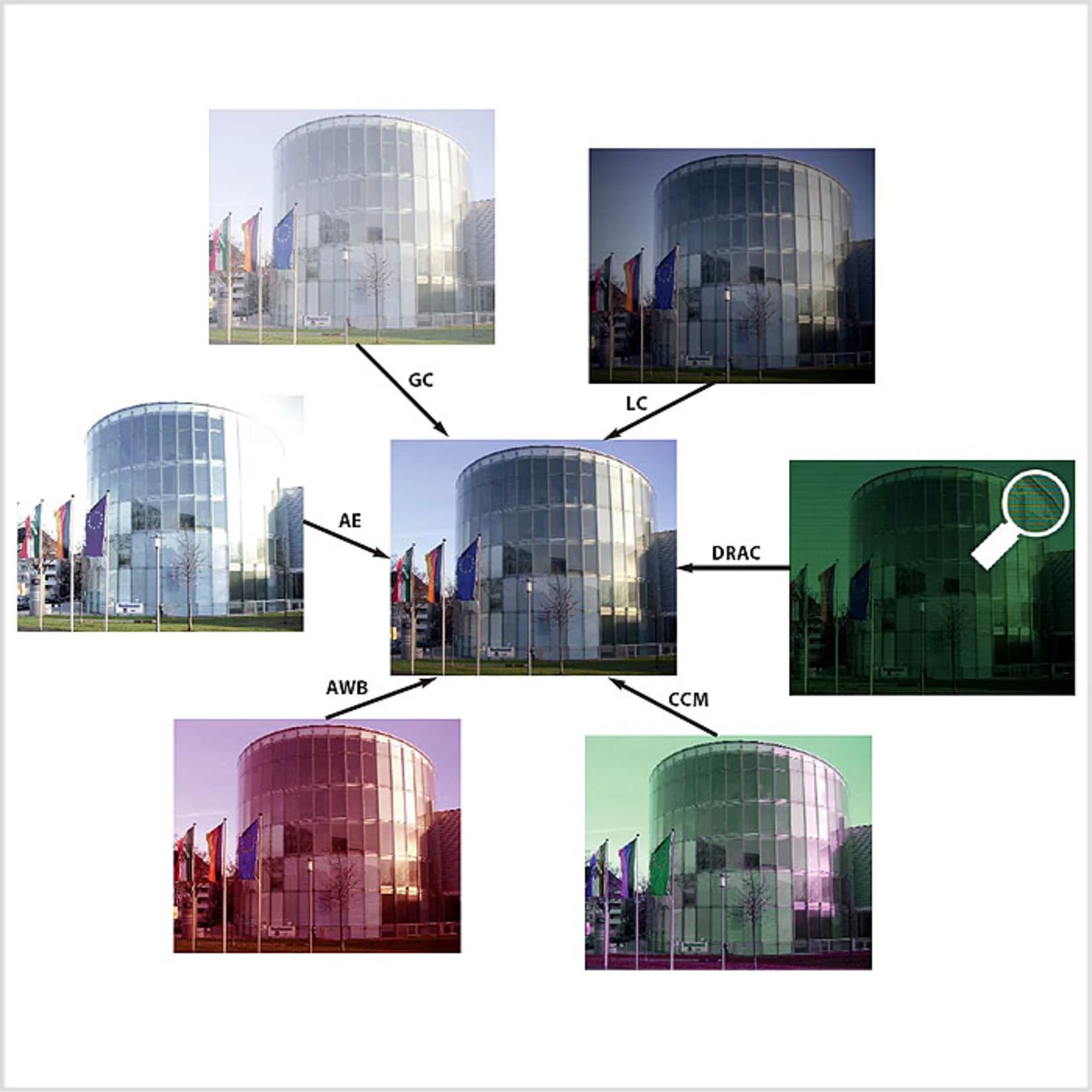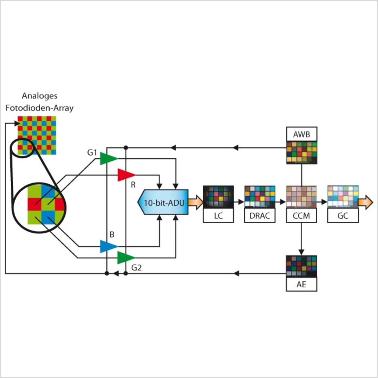 Enthält der Sensor zusätzlich noch Bildvorverarbeitungsblöcke, wie z.B. Farb-Demosaikfunktionen – z.B. nach dem Bayer-RGB-Muster –, Farbraumumwandlungen oder auch JPEG-Codecs, so spricht man von Systemon-Chip-Sensoren. Ein SoC-Sensor enthält in der Regel alle Funktionsblöcke, die notwendig sind, um aus den Rohdaten des Sensors ein RGB-Bild – auch als Color Pipeline bezeichnet – zu generieren (Bild 1).