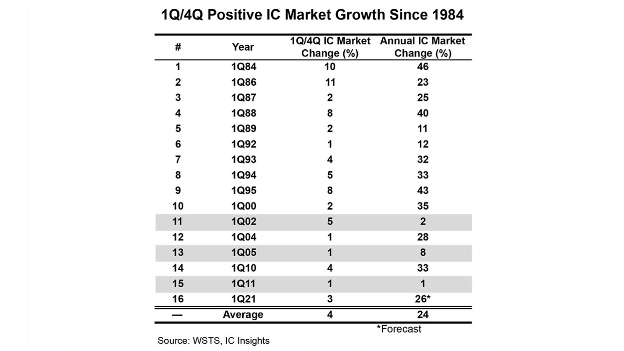 Für erwähnenswert halten die Analysten, dass es sich bei 1Q21/4Q20-IC-Marktwachstum von 3 Prozent um den ersten positiven 1Q/4Q-Wert seit 2011 handelt. Seit 1984 gab es 15 positive 1Q-Werte. Die Jahre mit den positiven 1Q-Werten endeten fast alle – abgesehen von drei Ausnahmen (im Schaubild grau schattiert) – mit einem starken zweistelligen Wachstum des IC-Marktes. Die Schätzung des Wachstums von IC Insights in Höhe von 26 Prozent liegt leicht oberhalb des Durchschnittswertes des IC-Wachstums in den Jahren, deren 1Q/4Q-Wert seit 1984 positiv ausgefallen war.