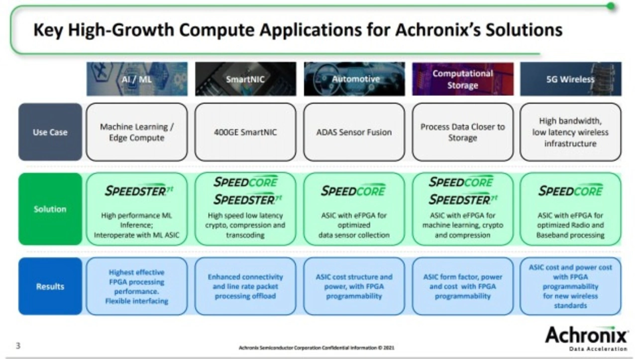 Die Achronix Speedcore eFPGAs sind typischerweise in Anwendungen zu finden, die ein hohes Volumen aufweisen, oder in Anwendungen, in denen die Leistungsanforderungen mit handelsüblichem Silizium nicht erfüllt werden können. Heutzutage gibt es mehrere Schlüsselmärkte, die die Vorteile von Speedcore eFPGA IP nutzen wollen. Dazu zählen zum Beispiel Automotive, Telekommunikation, Hyperscale-Rechenzentren und Industrie 4.0.