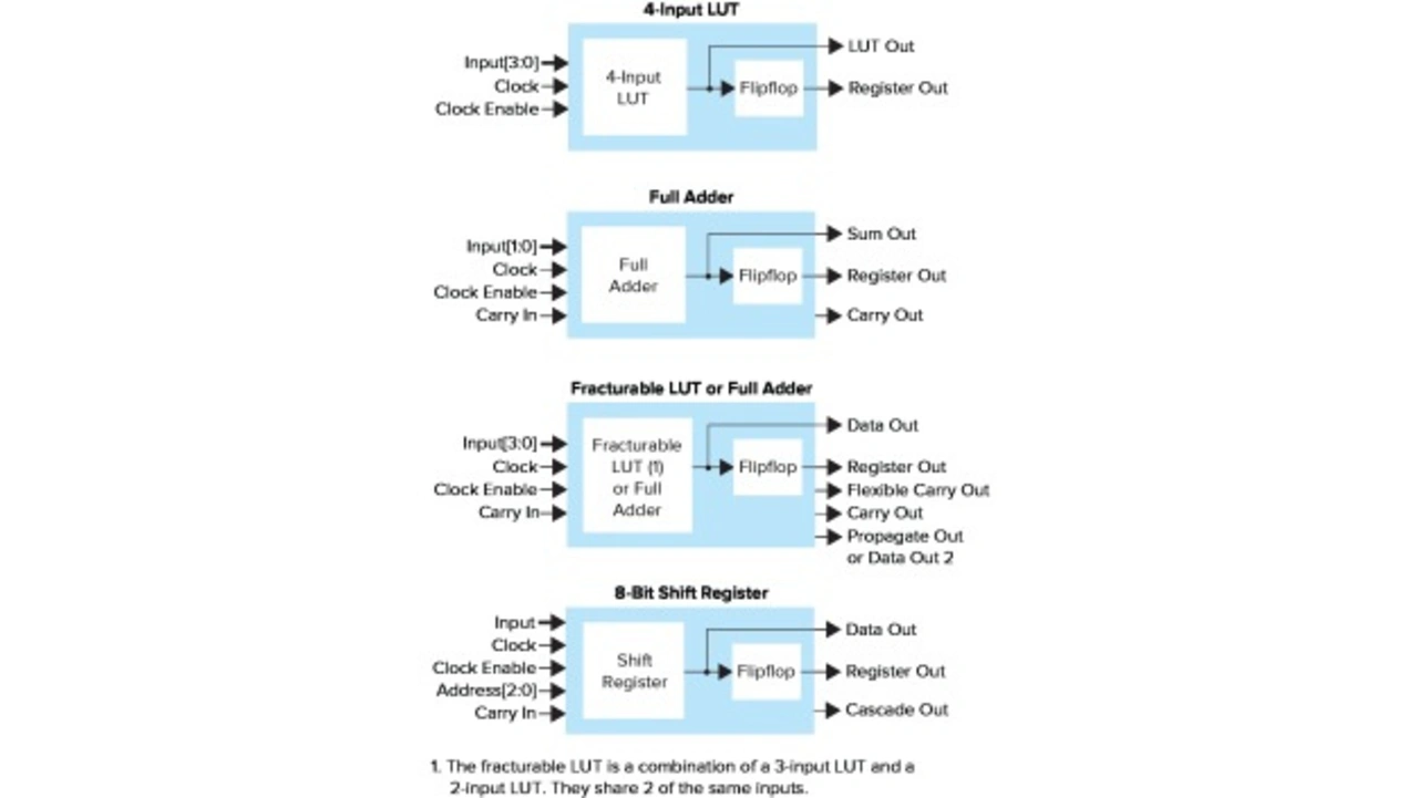 Bei den Titanium-FPGAs ist die Zuordnung von XLR-Zellen zu LEs nicht 1:1 wie bei der Trion-Familie. In der Titanium-Familie wurde die Quantum-Architektur aufgerüstet, um Rechenfunktionen besser zu unterstützen. Bei Titanium ist die XLR-Zelle mit einer zusätzlichen 8-Bit-Schieberegisterfunktionalität ausgestattet, so dass diese XLR-Zelle mehr als eine normale LUT mit 4 Eingängen und ein Flipflop kann. Darüber hinaus ist die 4-Eingangs-LUT aufteilbar, was bedeutet, dass sie gleichzeitig als 3-Eingangs-LUT und als 2-Eingangs-LUT fungieren kann, was noch mehr Möglichkeiten bietet (Abbildung 4). Diese Verbesserungen haben einen starken Einfluss auf die Menge der Logik, die die XLR-Zelle implementieren kann. Nach Tausenden von Experimenten zur Quantifizierung des Effekts der Titanium-XLR-Zellen hat Efinix festgestellt, dass diese die Möglichkeit bieten, 20 Prozent mehr Logik als eine reguläre LE zu packen.