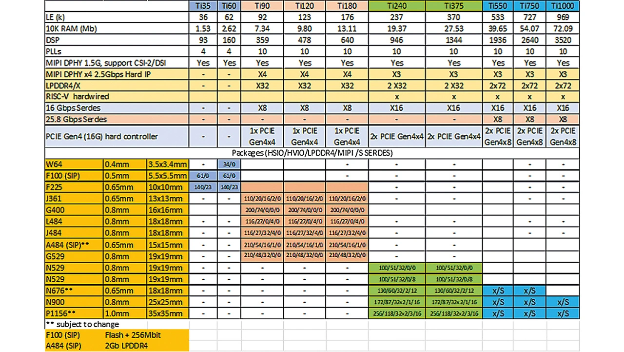 Die drei neuesten Familienmitglieder sind die FPGAs Ti90-, Ti120 und Ti180, die in den verschiedenen Gehäusen zur Verfügung stehen. Diese Bausteine weisen die gleichen Features wie die Ti60-FPGAs auf, darüber hinaus unterstützen sie zusätzlich auch MIPI CSI2/DSI bis zu 2,5 Gb/s sowie LPDDR4/X-Speicherschnittstellen mit bis 3,3 Gb/s (Gehäuse-abhängig).