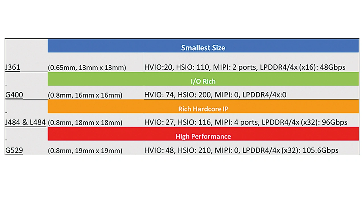 Das zurzeit kleinste Gehäuse für diese drei Bausteine ist eine BGA361- Variante (13 x 13 mm² mit einem Pitch von 0,65 mm). Dieses Gehäuse bietet zwei MIPI-x4-Schnittstellen (2,5 Gb/s) sowie eine 16 Bit-LPDDR4/x-Schnittstelle mit bis zu 3 Gb/s. Die Bausteine im G529-Gehäuse (19 x 19 mm², 0,8 mm Pitch) bieten eine Speicherschnittstelle bis 3,3 Gb/s mit einer Busbreite von 32 bit sowie 210 HSIOs und 48 HVIOs. Die Bausteine im 484-Gehäuse (18 x 18 mm2, 0,8 mm Pitch) bieten eine 32-bit-Speicherschnittstelle (nur J484) mit bis zu 3 Gb/s sowie 116 HSIOs und 27 HVIOs. Für Applikationen, die mehr I/Os benötigen, steht ein BGA400 (16 x 16 mm2, 0,8 mm Pitch) zur Verfügung, das 200 HSIOs sowie 74 HVIOs aufweist.