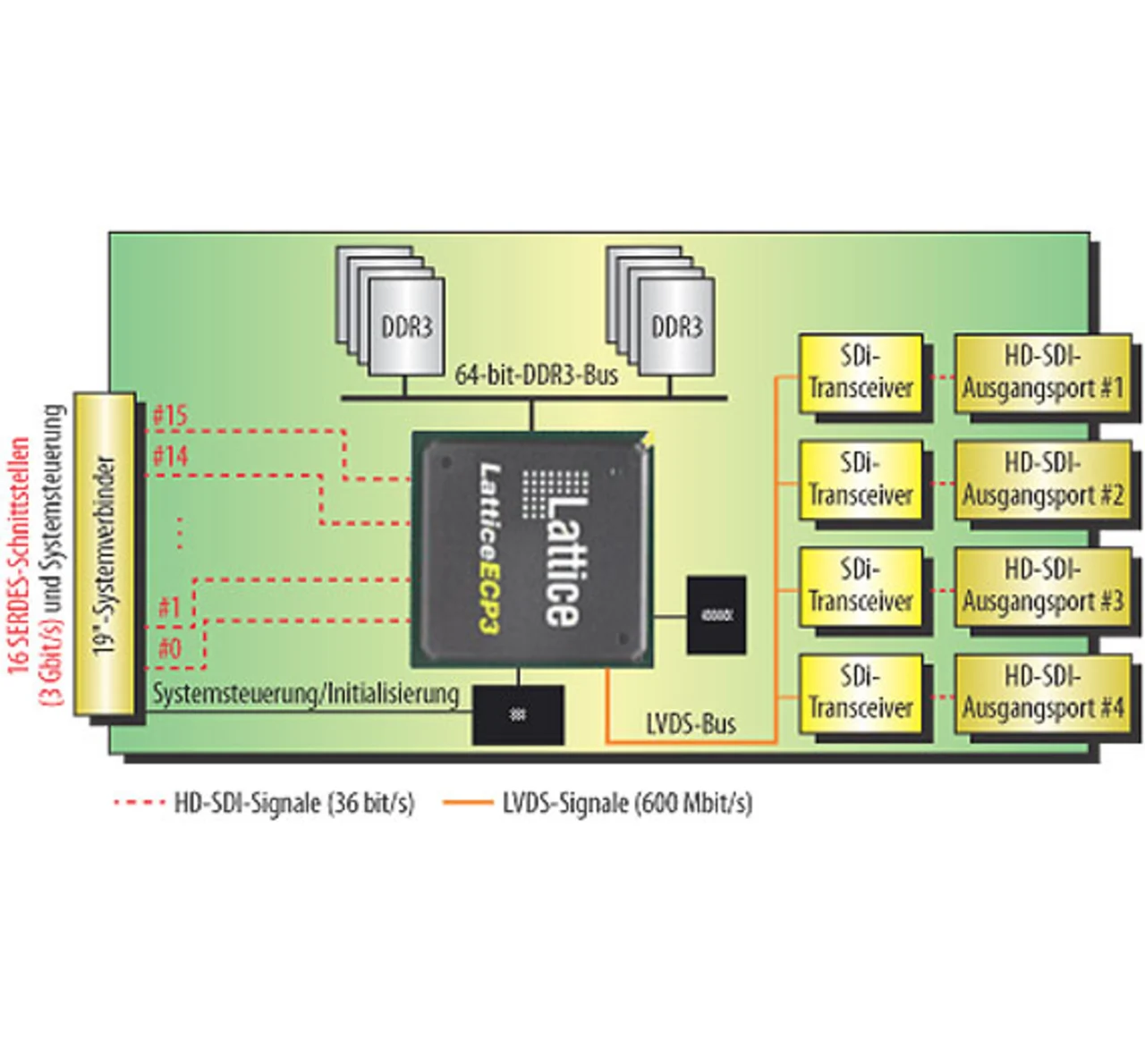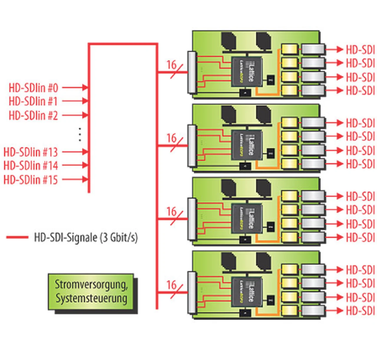 Bild 2 zeigt den Aufbau einer FPGA-Karte mit dem Lattice ECP3-150. Das Gesamtsystem (Bild 3) kann bis zu vier FPGA-Karten aufnehmen und erlaubt damit dem Anwender, 16 HD-SDI-Videoeingänge im Vollausbau auf 16 HD-SDI-Videoausgänge zu schalten.