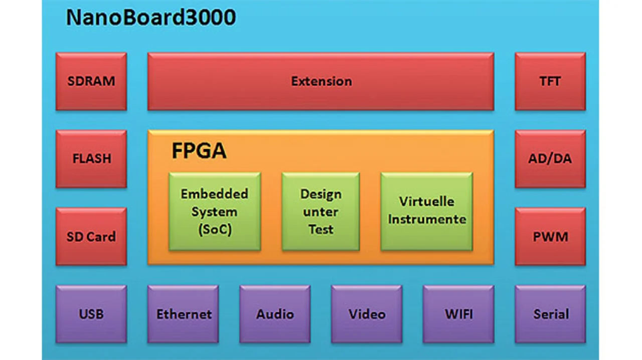 Die vorgestellte Methodik benötigt demnach zwingend ein FPGA mit der entsprechenden Umgebung. Zu frühen Projektphasen ist allerdings oft noch keine Hardware vorhanden. Deshalb bietet sich hierzu das NanoBoard 3000 von Altium an. Die bestückten FPGAs bieten ausreichend Platz und viele in einem Embedded-System benötigte Bausteine (z.B. Speicher), Darstellmöglichkeiten (z.B. TFT) und Schnittstellen (z.B. USB) sowie vielfältige Möglichkeiten zur Erweiterung sind, wie in Bild 1 gezeigt, bereits enthalten.