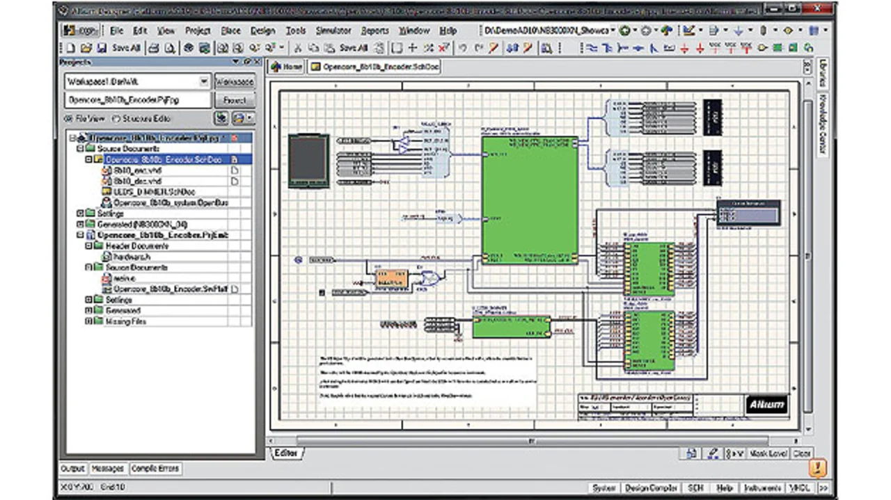 Demnach kann jeder, der mit Altium schon einmal eine Leiterplatte entworfen hat, mit exakt denselben Methoden auch ein FPGA entwickeln. Als erstes wird das zu prüfende Design mitsamt notwendiger Constraints als Block instanziiert und schematisch verdrahtet. Bild 2 zeigt das gesamte Projekt und das Top-Level-Schematic mit den beiden IPs von OpenCores, einem Embedded-System mit TFT und Speicher sowie einem anpassbaren, virtuellen Messinstrument, an dem alle Ein- und Ausgänge angeschlossen sind. Anwender können Funktion und Form dieser virtuellen Messinstrumente beliebig gestalten, indem sie die angeschlossenen Ein- und Ausgänge messen, darstellen oder verändern, ohne das FPGA neu zu programmieren.
