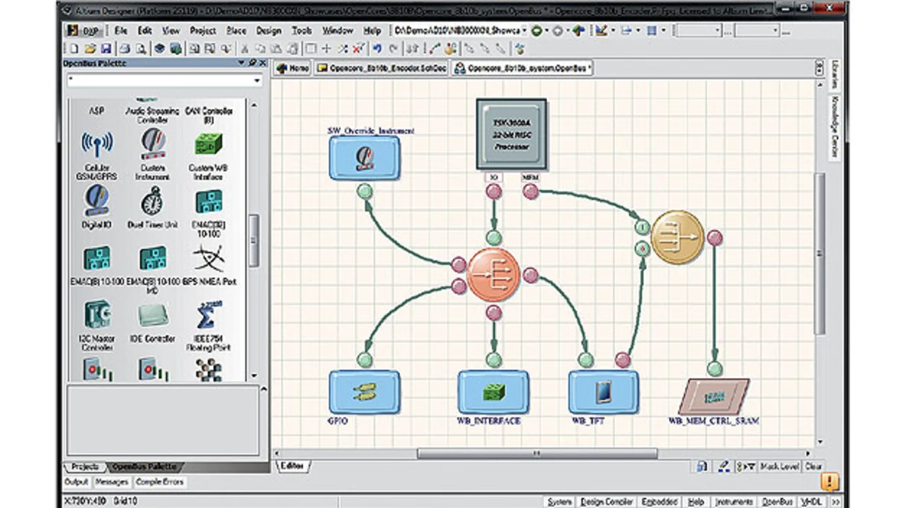 Die verwendete Soft-CPU-Architektur TSK3000 ist herstellerunabhängig und ebenfalls Wishbone-basierend. Die einzelnen Blöcke können aus der OpenBus-Palette platziert und miteinander verbunden werden. Diese enthalten zunächst die für das NanoBoard 3000 passende Konfiguration inklusive Pin-Informationen. Bei Verwendung einer anderen Ziel-Hardware müssen diese gegebenenfalls angepasst werden. Das OpenBus genannte Konzept basiert auf dem Wishbone-Standard, so dass beliebige - von OpenCores stammende - IPs neben den eigenen und den in Altium Designer vorhandenen IPs ohne Buskonverter direkt verwendet werden können. Für alle anderen Fälle (im vorliegenden Beispiel einfach eine 8-bit-Schnittstelle mit Steuerpin) steht eine konfigurierbare Wishbone-Schnittstelle zur Verfügung. Ebenso wird in diesem Beispiel ein Arbiter verwendet, der dem Speicher eine höhere Priorität bei gemeinsamen Zugriffen auf den verwendeten externen SRAM gewährt.