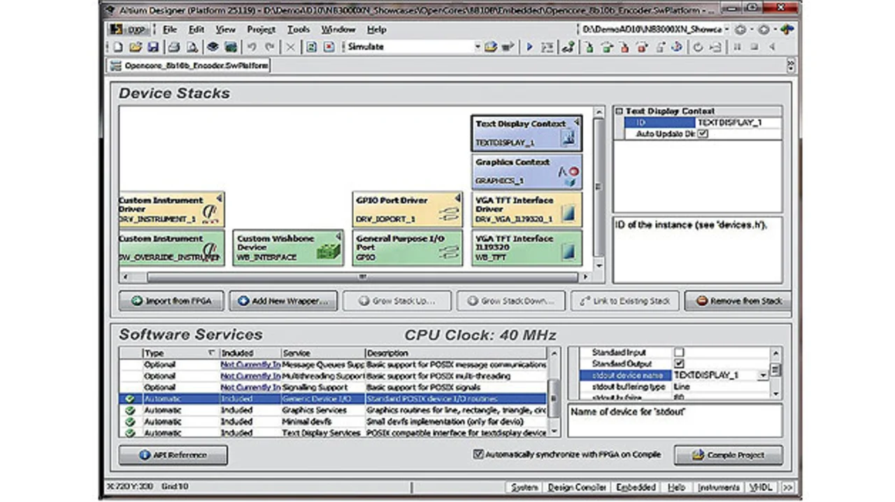 Der sogenannte Software Platform Builder (SPB) startet bei Verwendung eines TFTs zum Beispiel automatisch einen POSIX-Service. Im SPB wird das TFT jetzt als Standard-Output deklariert (siehe Bild 4). Anschließend reicht ein einfaches „printf“ im Quellcode, um einen Wert auf dem TFT darzustellen. Die notwendigen Header (zum Beispiel Schrift- und Displaygröße, Zeilenbreite sowie Font) sind im SPB bereits vordefiniert. Die Default-Werte stimmen hierbei mit den Bausteinen auf dem NanoBoard 3000 überein und müssen unter Umständen bei Verwendung einer anderen Ziel-Hardware angepasst werden. Deswegen generiert der SPB alle Quelltexte in C und stellt diese dem Entwickler zur weiteren Benutzung und Modifizierung kostenfrei zur Verfügung.
