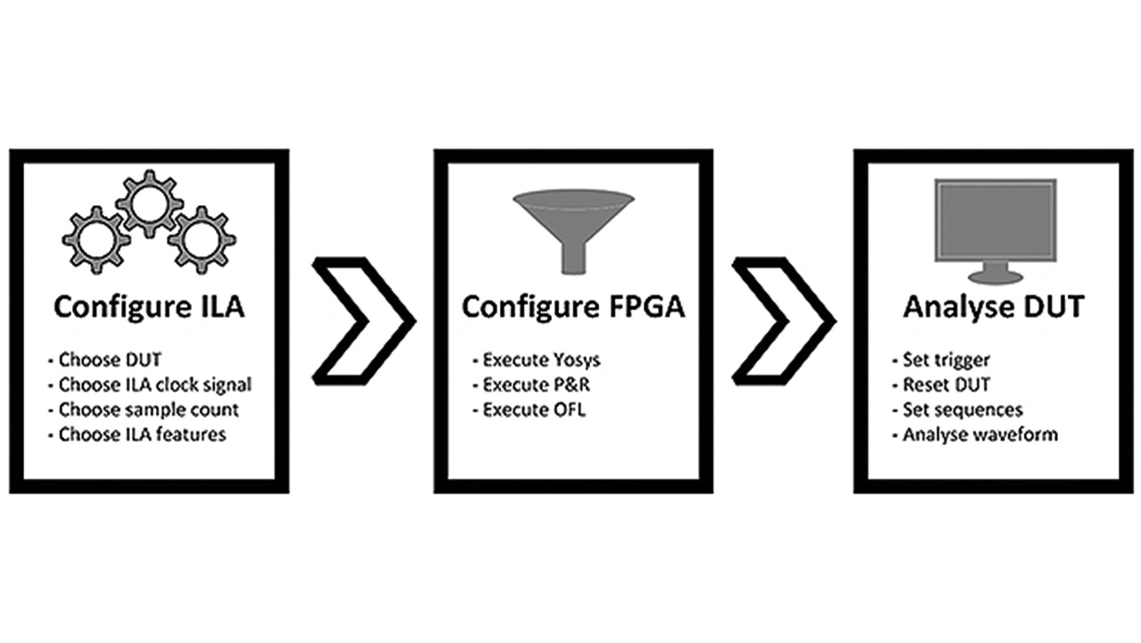 Der gesamte Workflow wird durch das Python-Programm ILAcop gesteuert (Bild 2). Als erstes muss die Gateware des ILA für das individuelle DUT konfiguriert werden. Konfigurationen wie die Taktquelle des ILA, die Auswahl der zu testenden Signale sowie die Dauer der Datenerfassung sind von dem zu analysierenden DUT abhängig und können neben weiteren Funktionen individuell eingestellt werden.