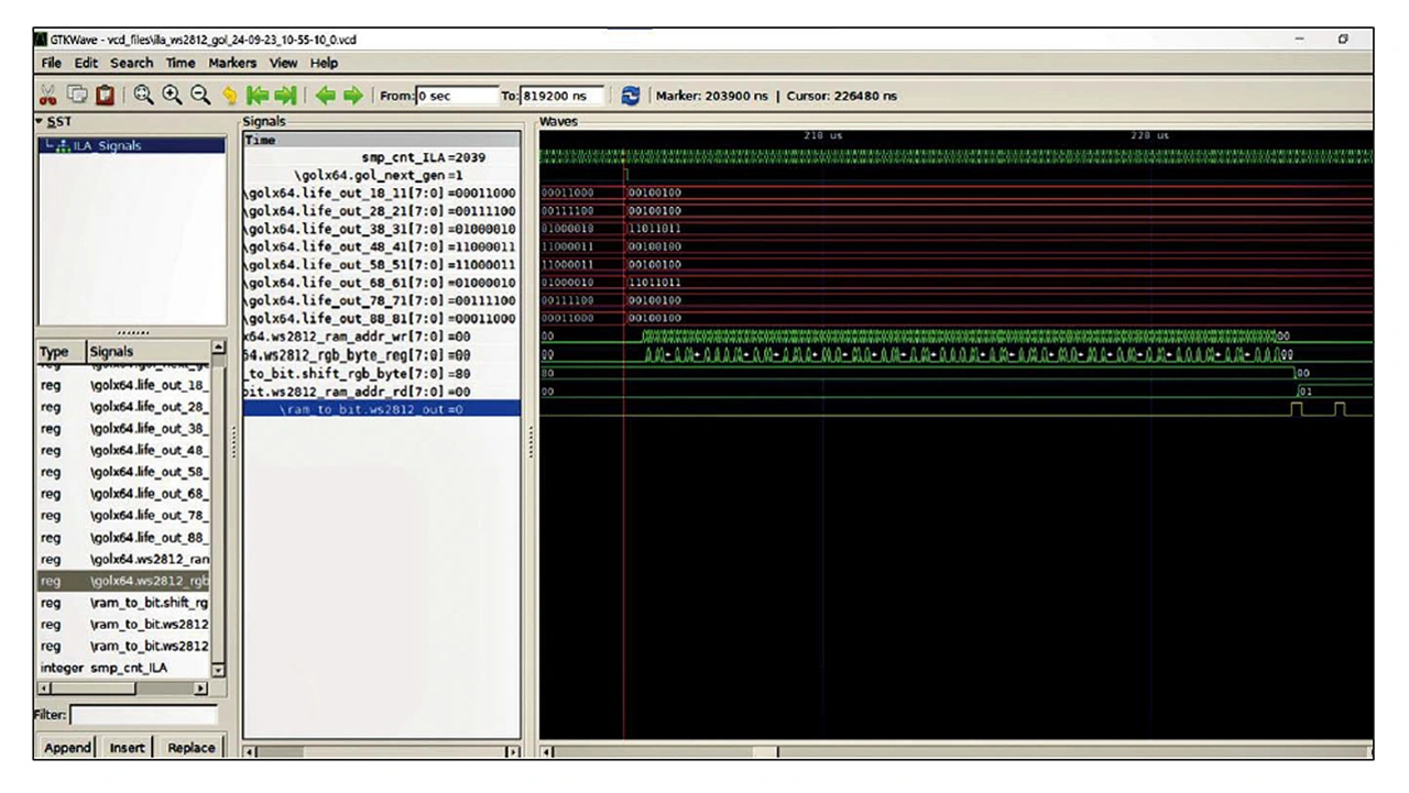 Bild 3 zeigt ein mit GTKWave visualisiertes Beispiel für ein Timing-Diagramm, in dem vom ILA aufgezeichnete Signale eines DUT aus dem FPGA dargestellt werden. Alternativ kann jede andere Software zur Darstellung des Timing-Diagramms mit VCD-Import verwendet werden. In der Signalbezeichnung im Zeitdiagramm steht vor dem Signalnamen, durch einen Punkt getrennt, die Modulhierarchie, in der das Signal im originalen Design zu finden ist. Weitere Informationen zu diesem speziellen Beispiel-DUT befinden sich im öffentlichen Git-Repository des Cologne Chip GateMate ILA im Verzeichnis »gatemate_ila/example_dut/ws2812_gol/«.