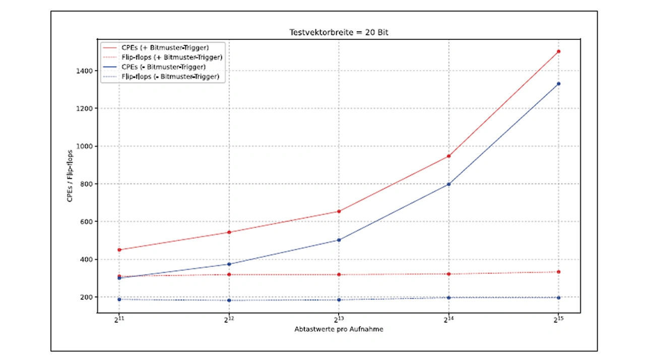Bild 4 zeigt den Ressourcenverbrauch des ILA bei einer konstanten Testvektorbreite von 20 bit. Die Anzahl der Abtastwerte je Aufzeichnung wird für jeden Prüfpunkt um eine Zweierpotenz erhöht. Es fällt auf, dass die Anzahl der verwendeten Flip-Flops konstant bleibt. Dies liegt daran, dass die vom ILA benötigten Register, mit Ausnahme des Speicheradresszählers, von der Testvektorbreite abhängen. Die zusätzlich benötigten CPEs dienen der Erweiterung des Speichers unter Verwendung der vorhandenen RAM- Blöcke. Während für 2048 Abtastwerte nur ein RAM-Block benötigt wird, erhöht sich der Bedarf bei 32.768 Abtastwerten auf 32 RAM-Blöcke. Diese werden mithilfe von CPEs so konfiguriert, dass sie zusammen wie ein einziger RAM mit 32.768 Speicheradressen funktionieren.