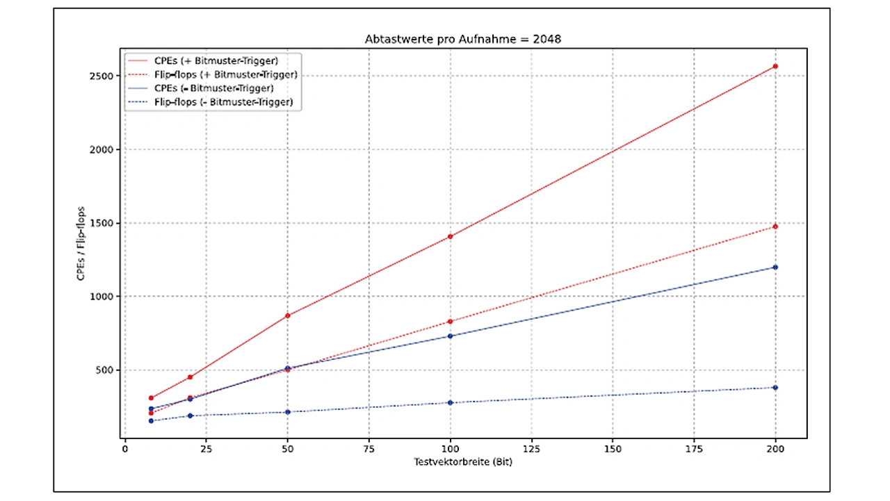Bild 5 zeigt den Ressourcenverbrauch, wenn die Testvektorbreite erhöht wird, während die Anzahl der Abtastwerte pro Erfassung konstant bleibt. Hierbei ist deutlich zu erkennen, dass der Bedarf an Hardware mit steigender Testvektorbreite nahezu linear zunimmt. Dabei steigt der Hardwareverbrauch mit aktiviertem Bitmuster-Trigger deutlich steiler an.