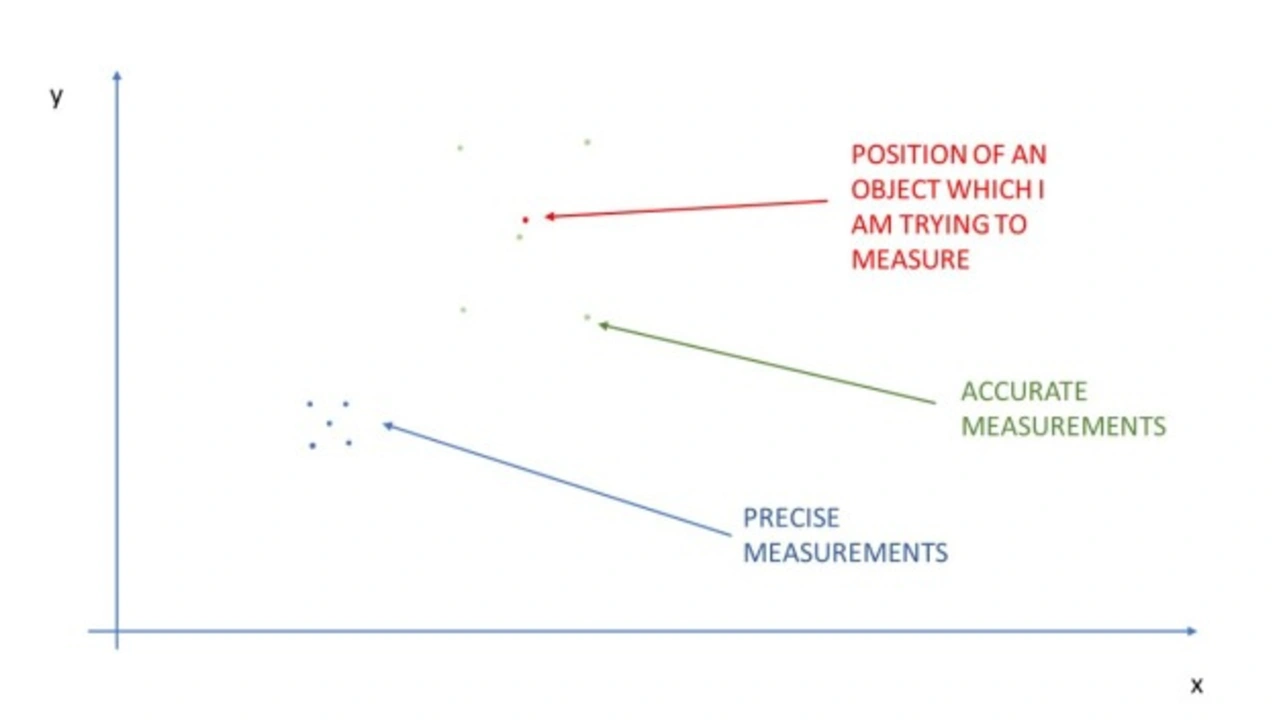 Auf der Basis der obigen Definitionen ist das grüne Instrument genauer als das blaue, während das blaue präziser ist als das grüne. Somit ist leicht erkennbar, dass Genauigkeit und Präzision voneinander unabhängige Konzepte sind. In anderen Worten: Es lässt sich zeigen, dass die Mittelwertbildung nur dann in der Lage ist, unsere Kenntnis über die Position des Objekts zu verbessern, wenn das Messsystem genau ist.