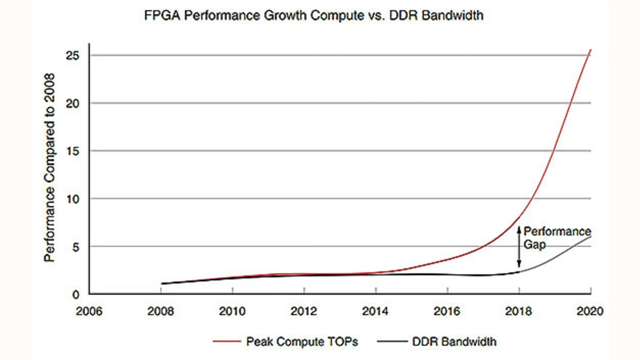 Viele aktuelle Applikationen wie künstliche Intelligenz (KI), Datenanalysen, das Transcodieren von Videosignalen und Genom-Analysen erfordern Speicher, die schnell große Datenmengen aufnehmen und ausgeben können. Traditionelle DDR-Speicher können mit diesen wachsenden Anforderungen nicht Schritt halten. Das sorgt für Datenengpässe. Bild 1 zeigt die wachsende Lücke zwischen Rechenleistung und der Datenübertragungsrate von DDR-Speichern.