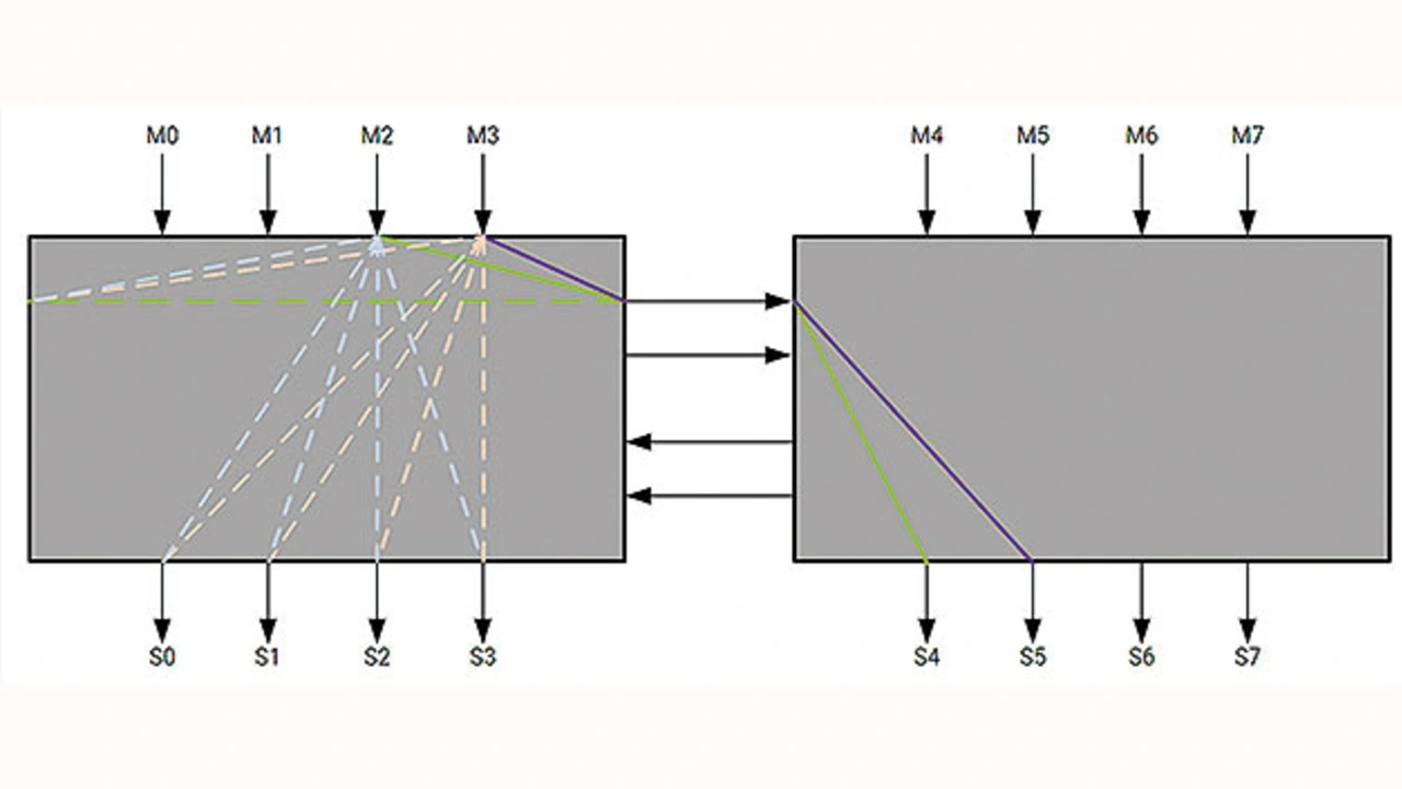 Für die flexible Adressierung über alle HBM-Stacks hinweg enthält der AXI-Switch Schaltelemente, die für jeweils vier Master und vier Slaves zuständig sind (Bild 2). Diese Schaltung erleichtert die flexible Adressierung. Doch es gibt einen Grenzwert, der die Datenübertragungsrate zum Speicher beeinflusst. Da nur vier horizontale Pfade verfügbar sind, kann der HBM-Stack die erzielbare Datenübertragungsrate durch Arbitrierung begrenzen.