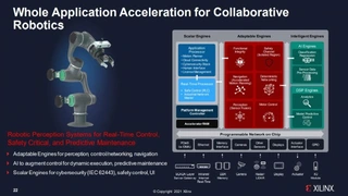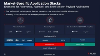 KI-fähige, automatisierte Systeme erfordern eine hohe Rechendichte, die ganze Anwendungen vom Sensor über KI bis zur Echtzeitsteuerung beschleunigen kann. Versal AI Edge-Bausteine erreichen dies durch eine 10-fache Rechendichte im Vergleich zu Zynq UltraScale+ MPSoCs und ermöglichen intelligentere autonome Systeme. Darüber hinaus unterstützen Versal AI Edge-Bausteine mehrere Sicherheitsstandards in den Märkten Industrie (IEC 61508), Luftfahrt (DO-254/178) und Automotive (ISO 26262), in denen Hersteller ASIL C für zufällige Hardware-Integrität und ASIL D für systematische Integrität realisieren müssen.