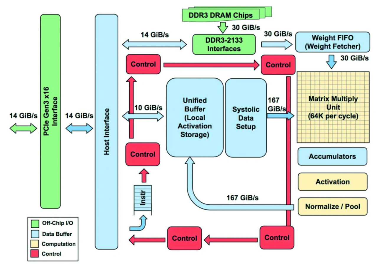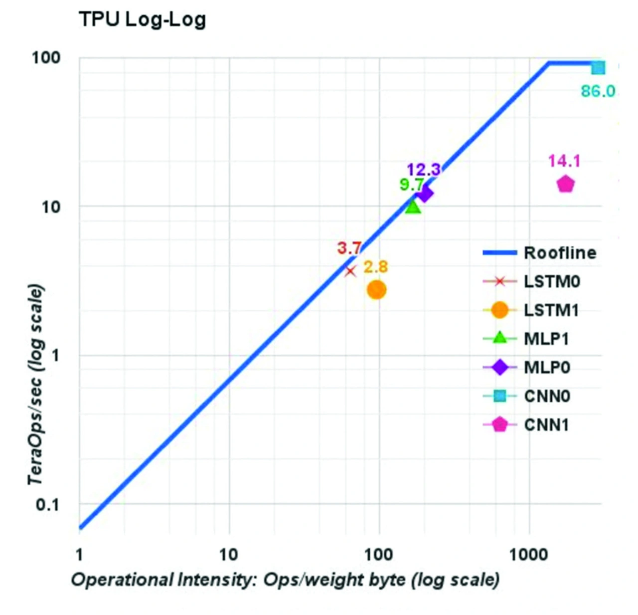 Die TPU ist nur ein Beispiel für einen sehr verallgemeinerten Tensor-Beschleuniger, der einen komplexen Compiler für Graph-Operationen einsetzt. Die TPU realisierte eine sehr gute Effizienz beim Durchsatz spezifischer Workloads (CNN0 bei 86 TOPS). Allerdings ist das Verhältnis der Berechnungs- zur Speicher-Referenz für CNNs geringer als bei MLPs und LSTMs, und es ist ersichtlich, dass diese spezifischen Workloads Speicher-bezogen sind. CNN1 zeigt eine niedrigere Rechenleistung (14,1 TOPS) – als direkte Auswirkung von Pipeline-Staus, die entstehen, wenn neue Gewichtungen in die Matrix-Einheit geladen werden müssen (Bild 2).