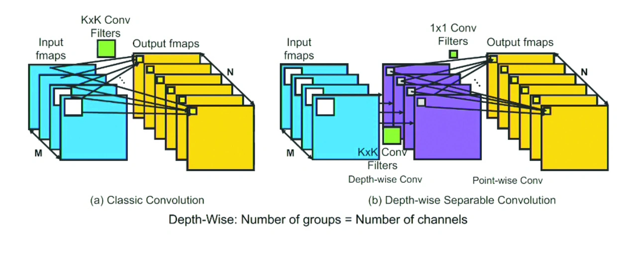 2017 präsentierte eine Forschergruppe von Google [2] eine neue Klasse von Modellen, die auf Mobilfunk-Applikationen zielte. Der Vorteil von MobileNet bestand in den beträchtlich reduzierten Rechenkosten bei gleichbleibend hoher Genauigkeit. Eine der in MobileNet realisierten Schlüsselinnovationen ist die Kanal-weise trennbare Faltung (Separable Depth-wise Convolution). Im Kontext der klassischen Faltung hat jeder Eingang einen Einfluss auf jeden Ausgangskanal. Wenn wir 100 Eingangskanäle und 100 Ausgangskanäle haben, gibt es 100 x 100 virtuelle Pfade. Allerdings teilt sich die Kanal-bezogene Faltung den Convolution Layer in 100 Gruppen auf, mit dem Ergebnis, dass es nur mehr 100 Pfade gibt. Jeder Eingangskanal ist also mit nur einem Ausgangskanal verbunden (Bild 4). Das erspart eine Menge an Rechenaufwand [3].