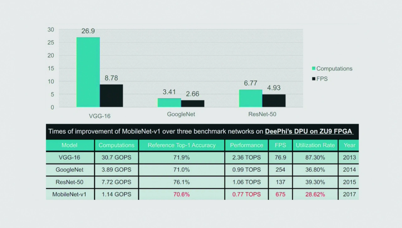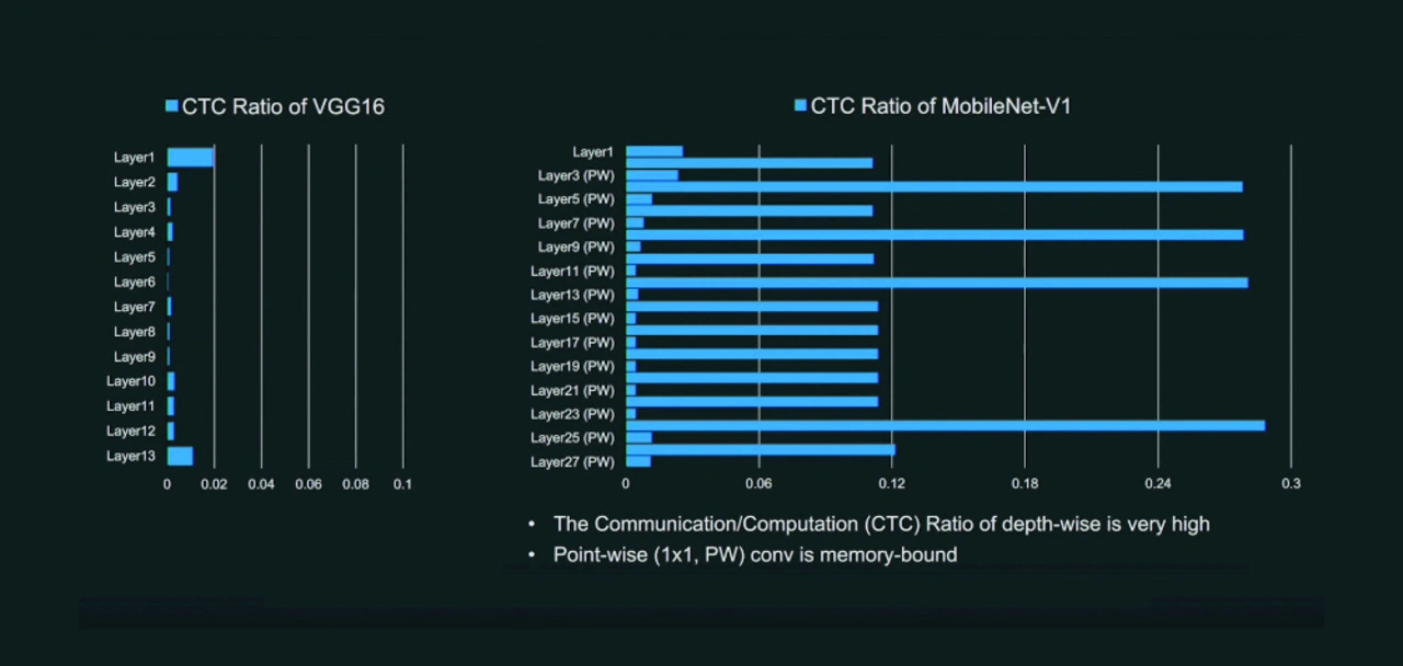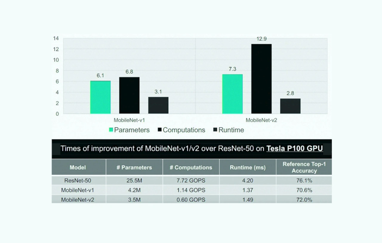 Ein Ergebnis dieser Betrachtung ist, dass für MobileNets das Verhältnis Rechner- zu Speicheraufwand reduziert ist – mit der Implikation, dass Speicherbandbreite und -latenz eine wichtigere Rolle spielen als die Erzielung eines hohen Durchsatzes.