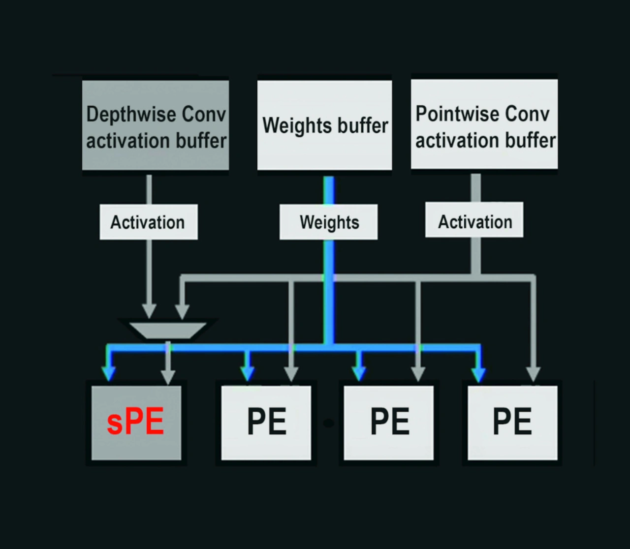 Um die DWC-Performance in der Hardware zu beschleunigen, wurde die Funktion der PEs (Processing Element) in der Xilinx DPU modifiziert und der DWC-Operator mit dem punktweisen CONV fusioniert. Nachdem ein Ausgangspixel in der ersten Schicht (Layer) verarbeitet wurde, wird die Aktivierung unmittelbar über die Pipeline an die 1x1-Faltung weitergeleitet (per On-Chip-BRAM-Speicher in der DPU), ohne sie in den DRAM zu schreiben. Mit diesem spezialisierten Verfahren lässt sich die Effizienz des MobileNet-Einsatzes auf der DPU wesentlich erhöhen (Bild 8) [3].