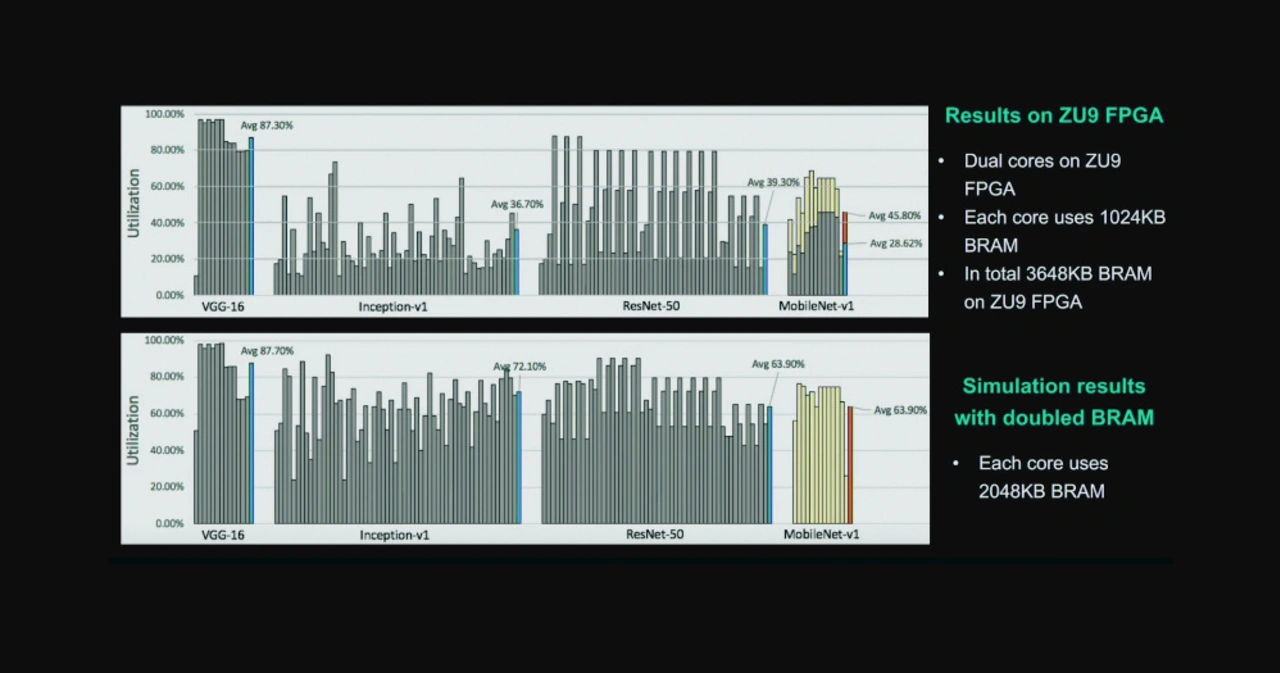 Für eine Inferenz fusioniert man typischerweise die DWC- mit der PWC-Faltung, legt die DWC-Aktivierungen im On-Chip-Speicher ab und startet gleich anschließend die 1x1-PWC. Im Kontext der Original DPU gab es keine spezialisierte Hardware-Unterstützung für DWCs, mit dem Ergebnis, dass der Wirkungsgrad nicht gerade ideal war (Bild 7) [3].