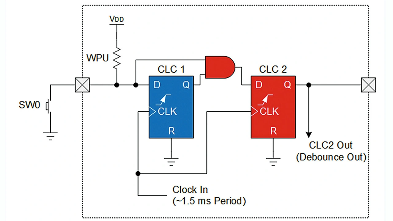Ein Beispiel, wie diese konfigurierbaren Elemente eingesetzt werden können, ist das Entprellen von Tastern und Schaltern auf Hardwareebene in Kombination mit einem Timer/Oszillator. Der Applikationsbericht 2805 (AN2805) beschreibt drei Möglichkeiten, eine Entprellung mit CLCs zu realisieren. Zwei der drei CLC-Versionen bieten einen guten Kompromiss zwischen Hardware-Ressourcennutzung und Leistung. Der Quellcode für alle drei Versionen ist auf Github verfügbar.