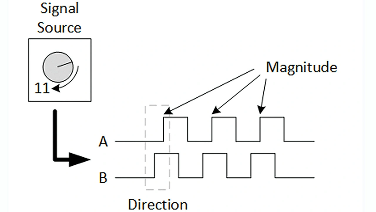 Eine weitere Anwendung der CLCs ist die Quadraturdecodierung. Inkrementale Quadratur-Encoder erzeugen zwei Rechteckwellen, deren eine Phase der anderen um 90 Grad vorauseilt. Der Betrag der Drehung wird durch die Anzahl der Wellen bestimmt, während die Phase der Welle die Richtung angibt. Bild 2 zeigt ein Beispiel für ein quadraturcodiertes Signal.